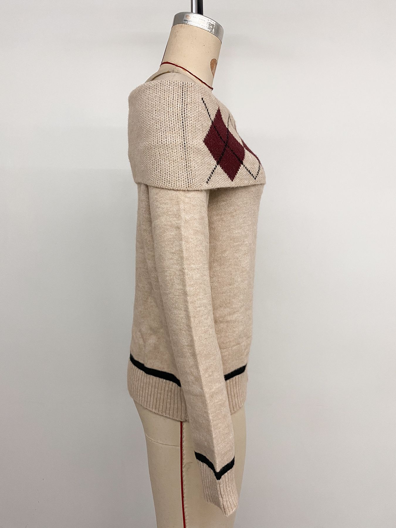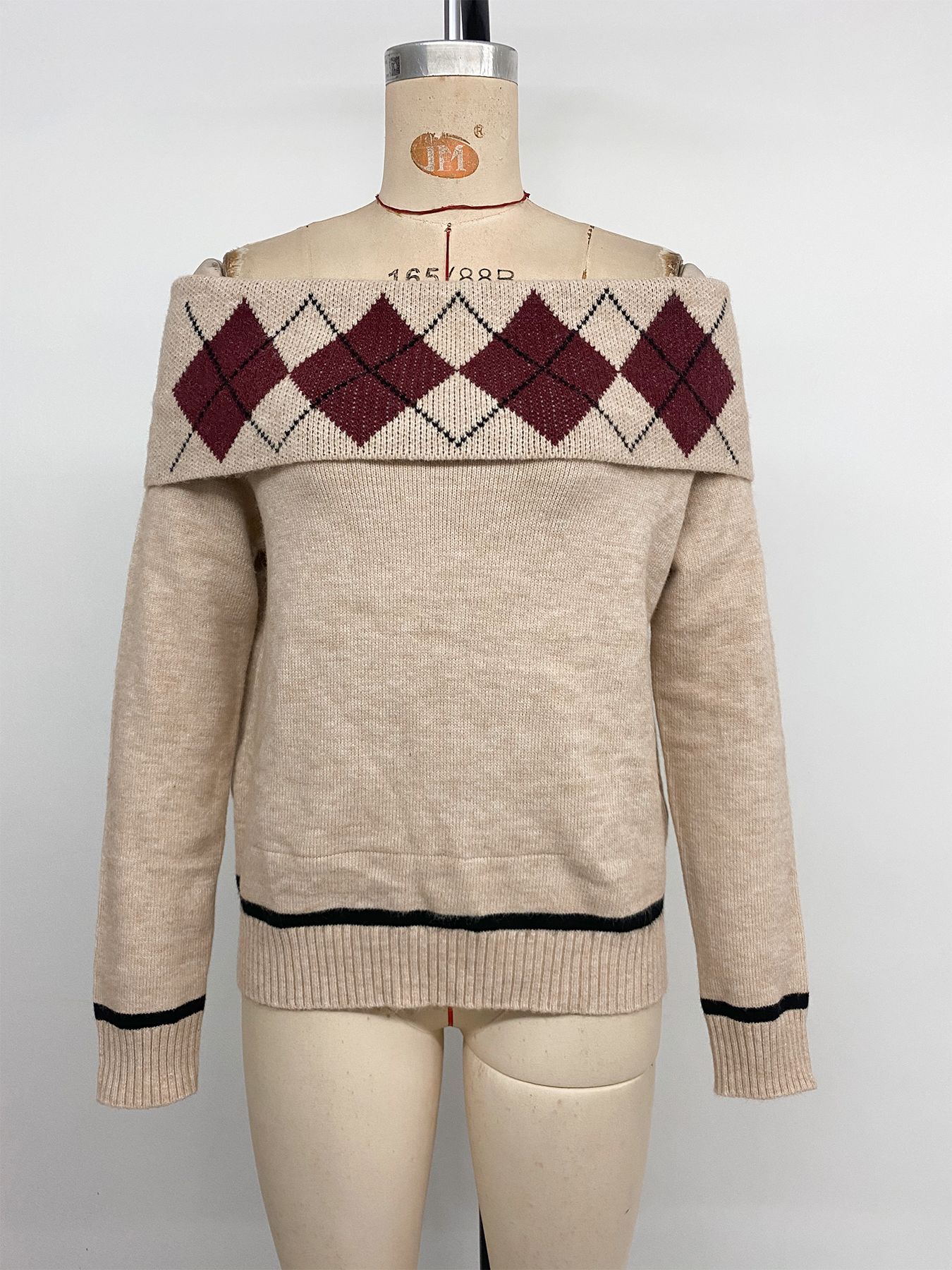 Pull ample à carreaux losanges jacquard sexy et élégant, épaules dénudées, automne-hiver