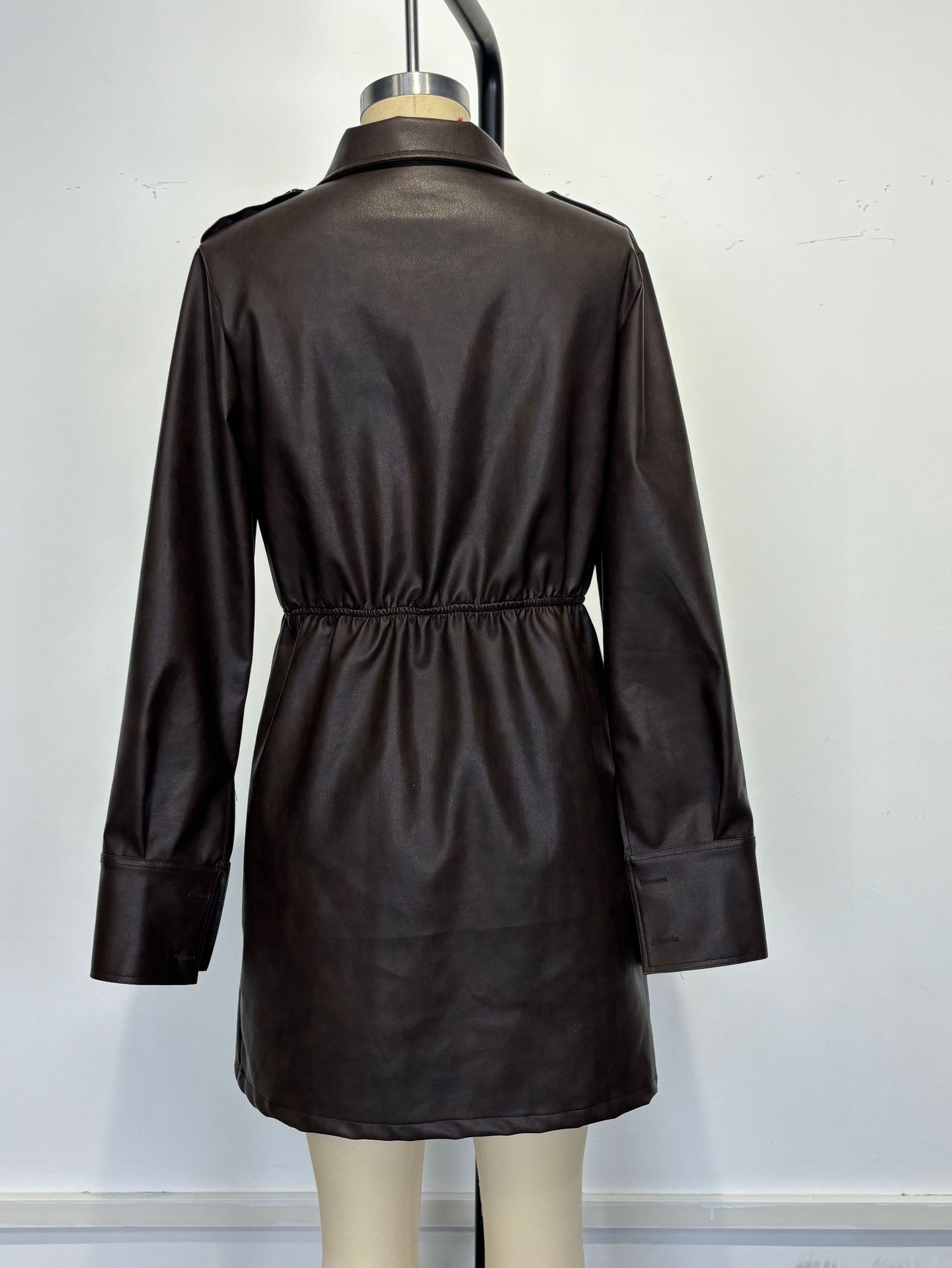 Robe polo unie automne-hiver en similicuir à manches longues, poche et fermeture éclair, pour femme