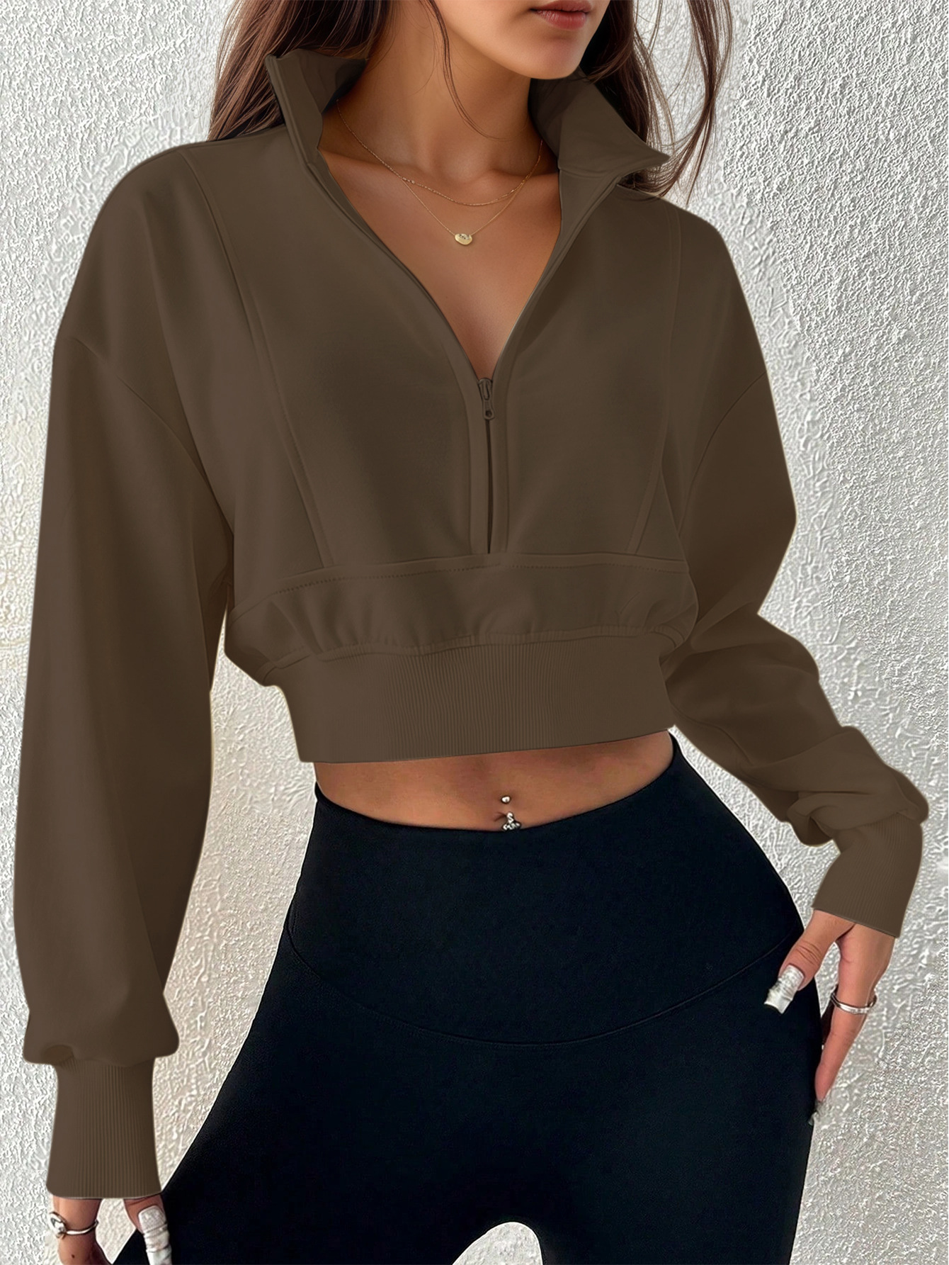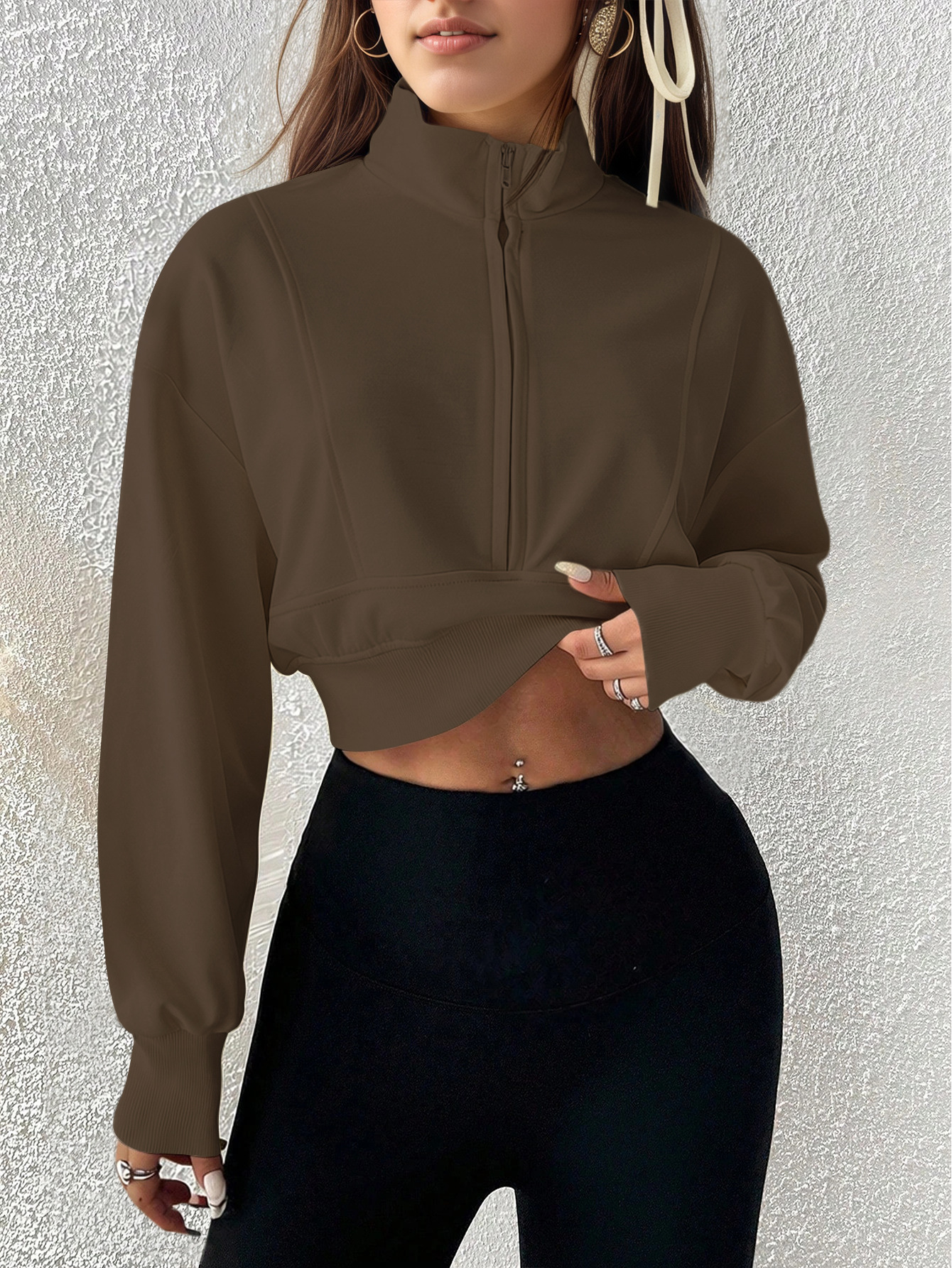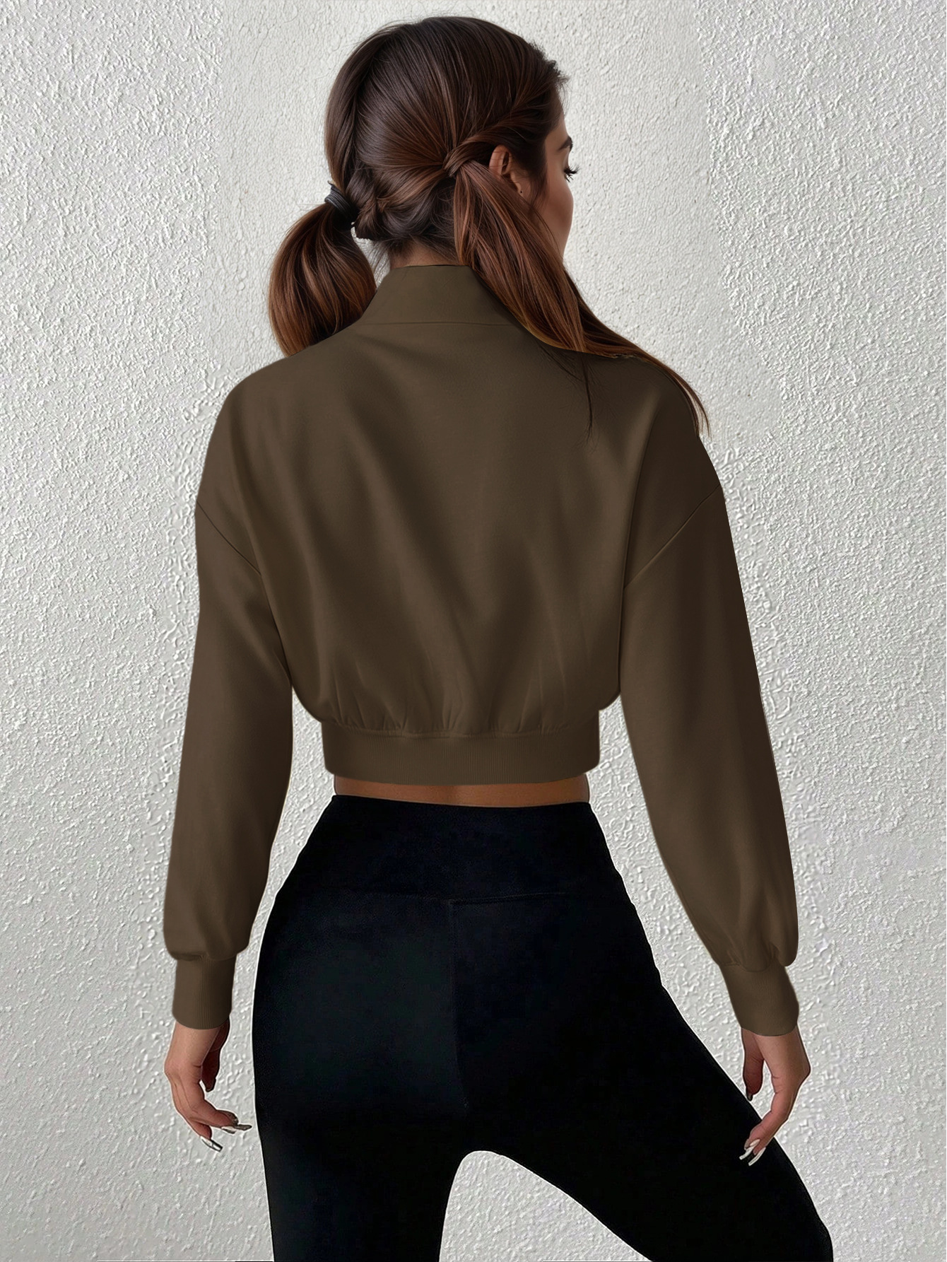 Pull court marron sauvage automne-hiver pour femme, col montant, fermeture éclair, style rétro, coupe ample, haut de sport décontracté