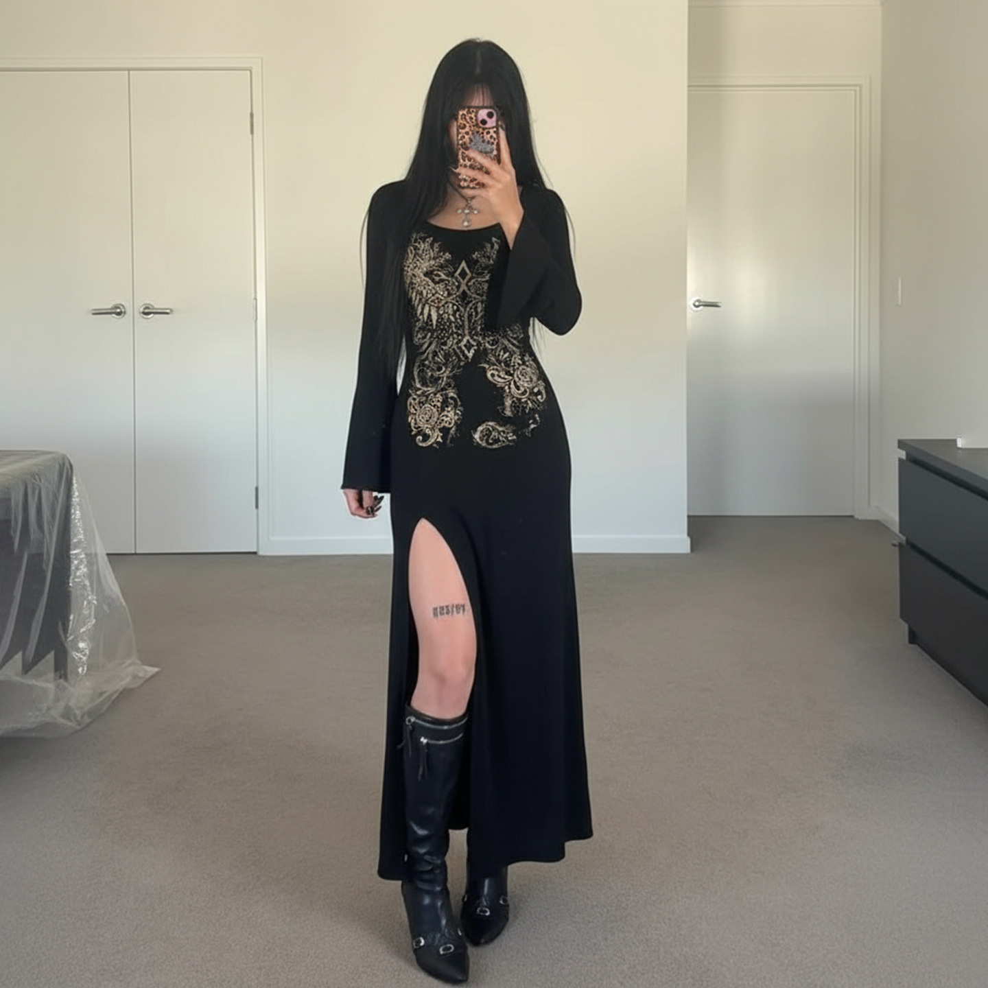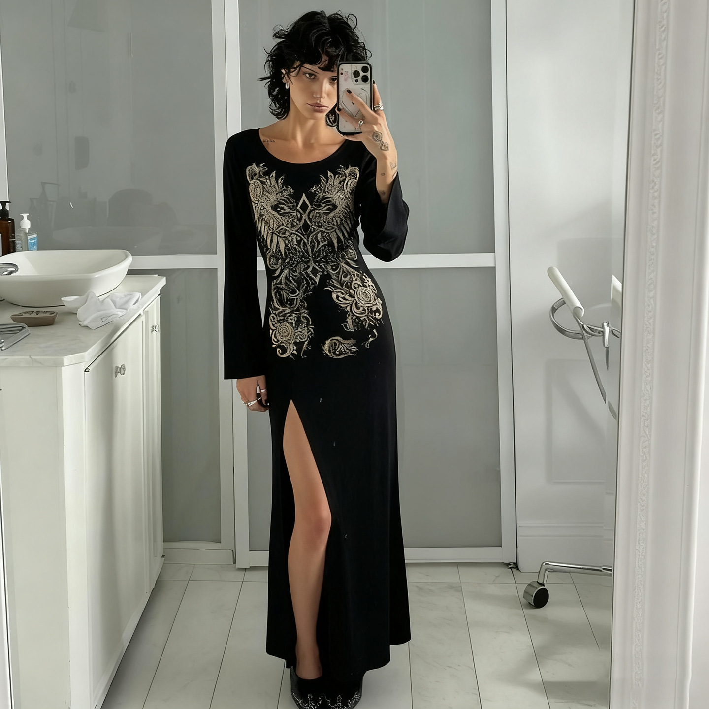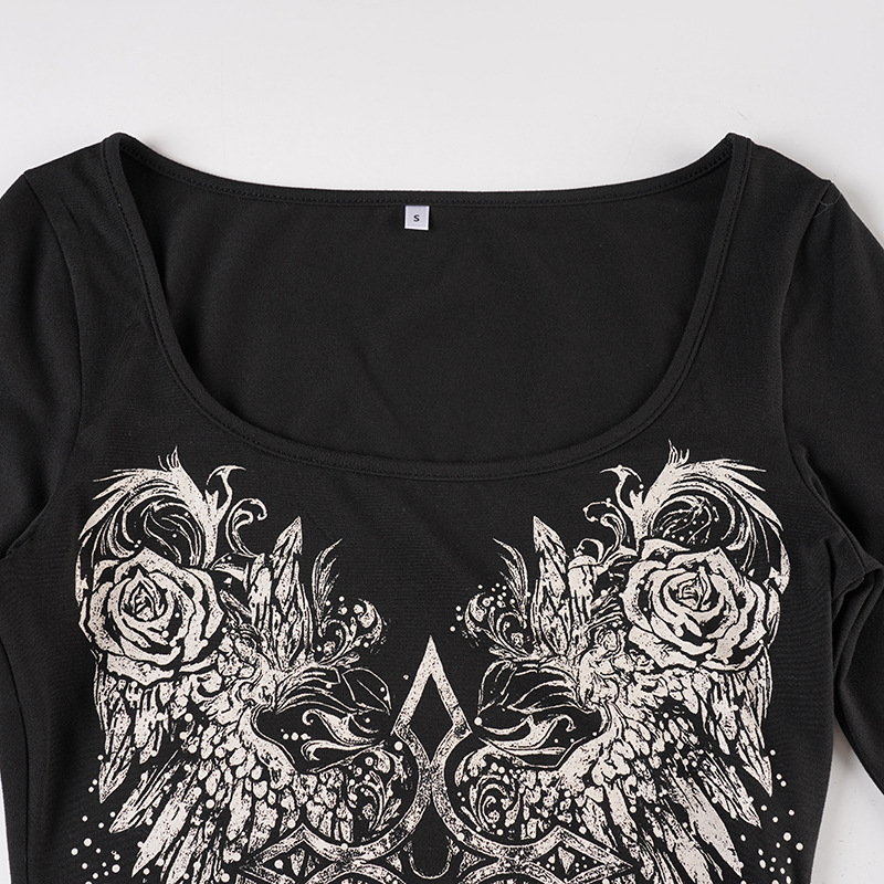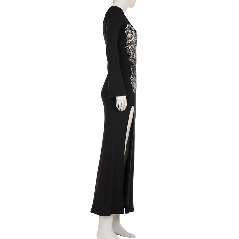 Arrival Dark Street Retro Printed Sexy Long Sleeved Dress Women Split Niche Dress