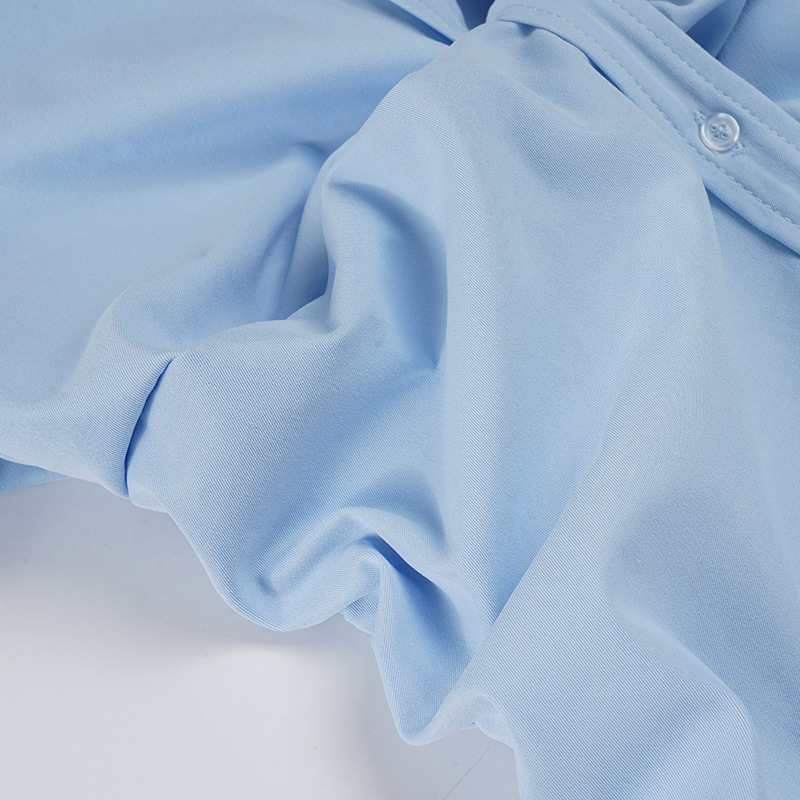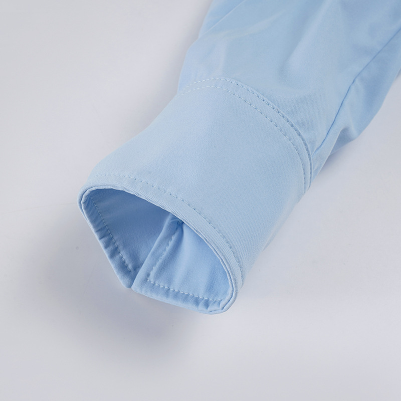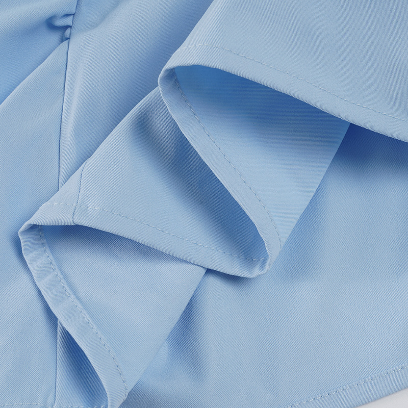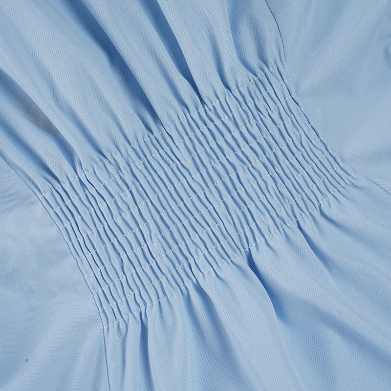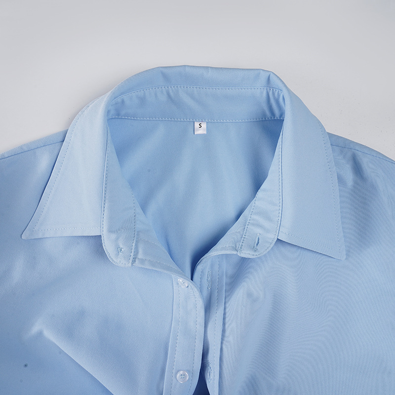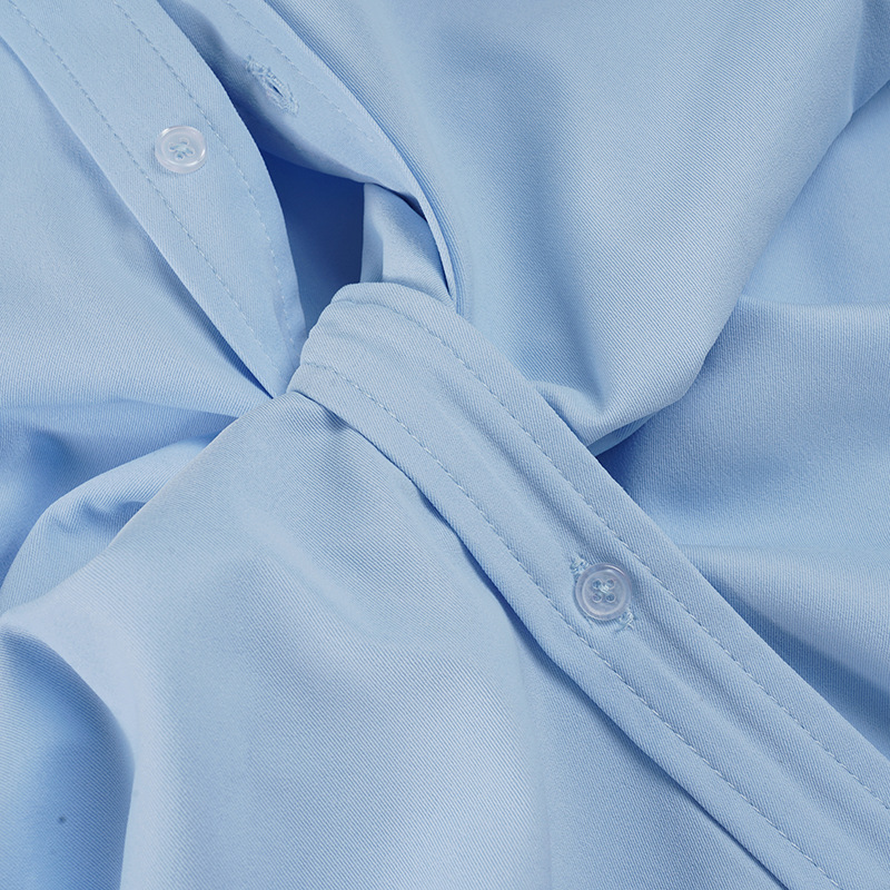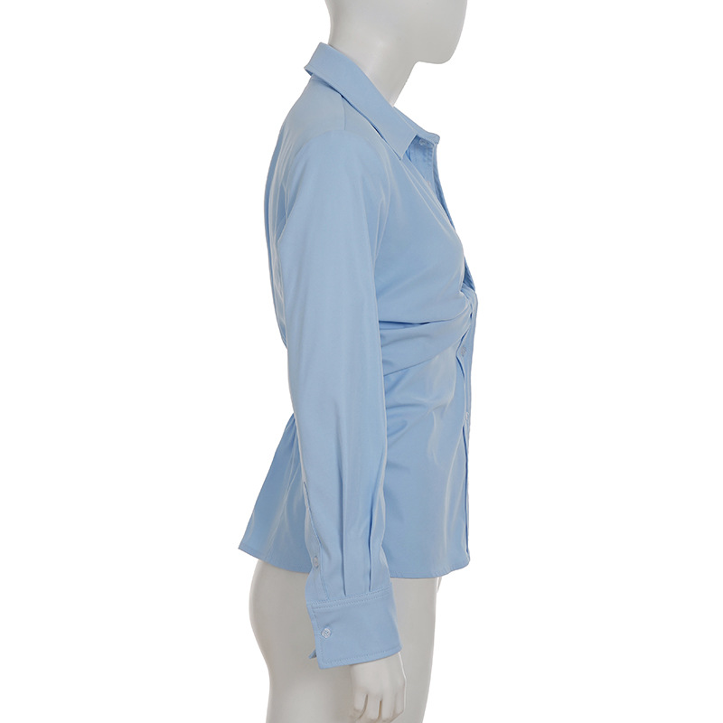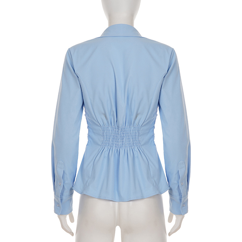 Autumn Flanging V neck Knot Pleated Slim Fit Blue Shirt Design Breasted Waist Controlled Slimming Long Sleeve Shirt Women