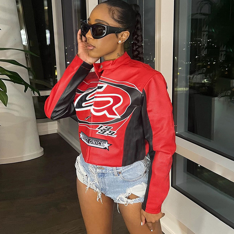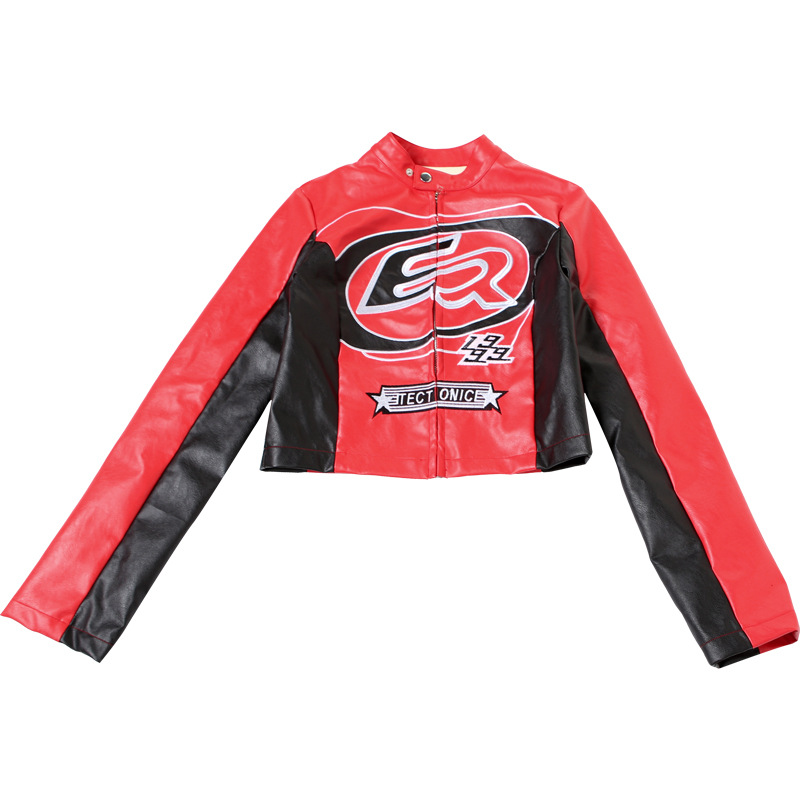 Autumn Winter Sexy Cropped Zipper Top Contrast Color Embroidery Short Fashionable Jacket