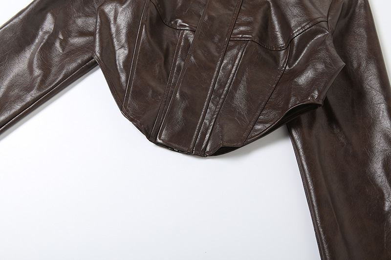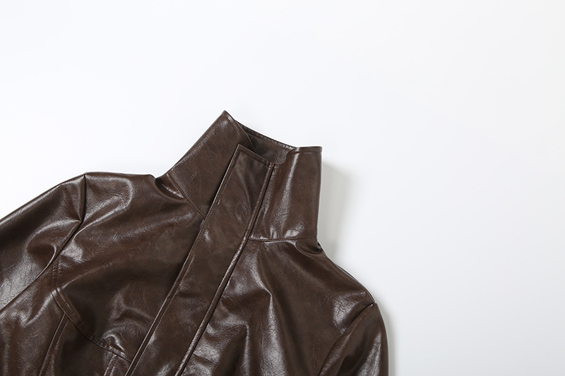 Autumn Winter Slim Slimming High Collar Solid Color Zipper Short Faux Leather Coat Women Clothing