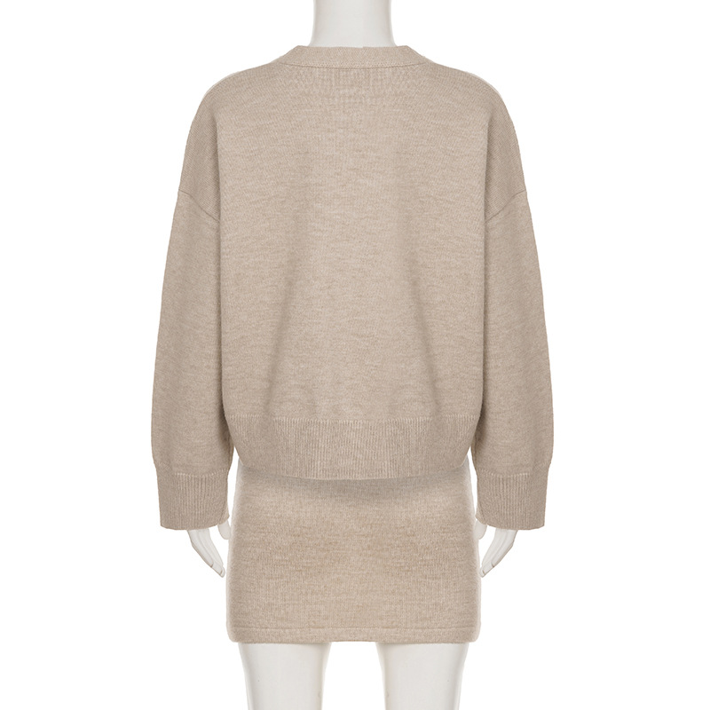 Autumn Winter Solid Color Long Sleeve Casual Cardigan Sweater Coat Skirt Outfit Classic Two Piece Set