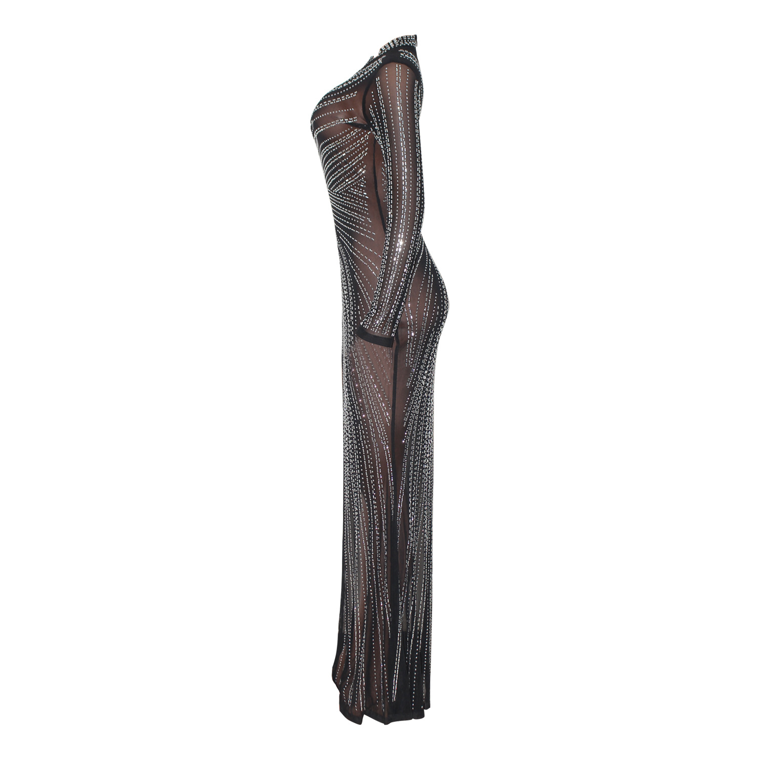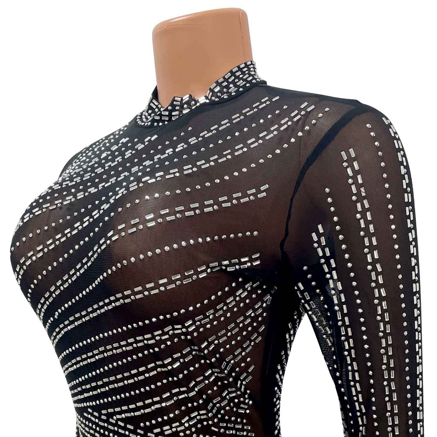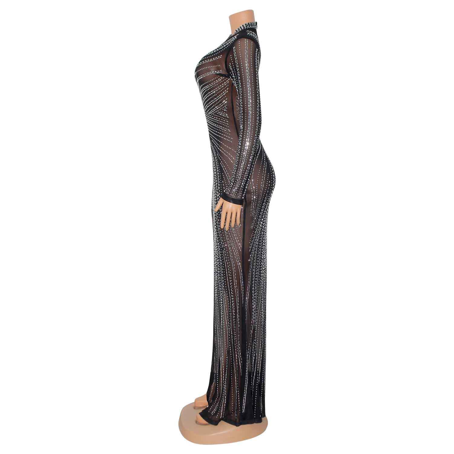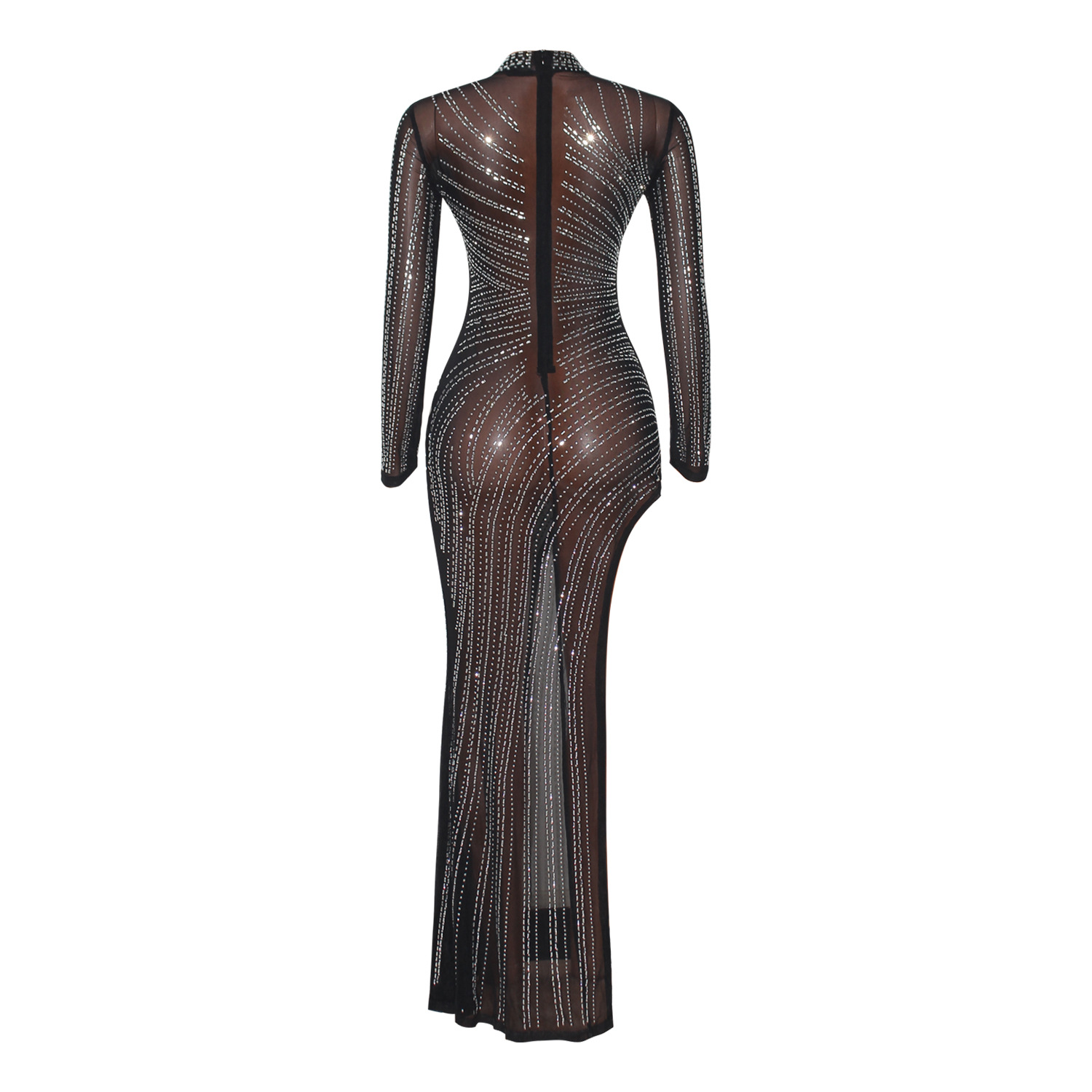 Autumn Winter Women Clothing Sexy Mesh Rhinestone Long Sleeve Irregular Asymmetric Dress High Split