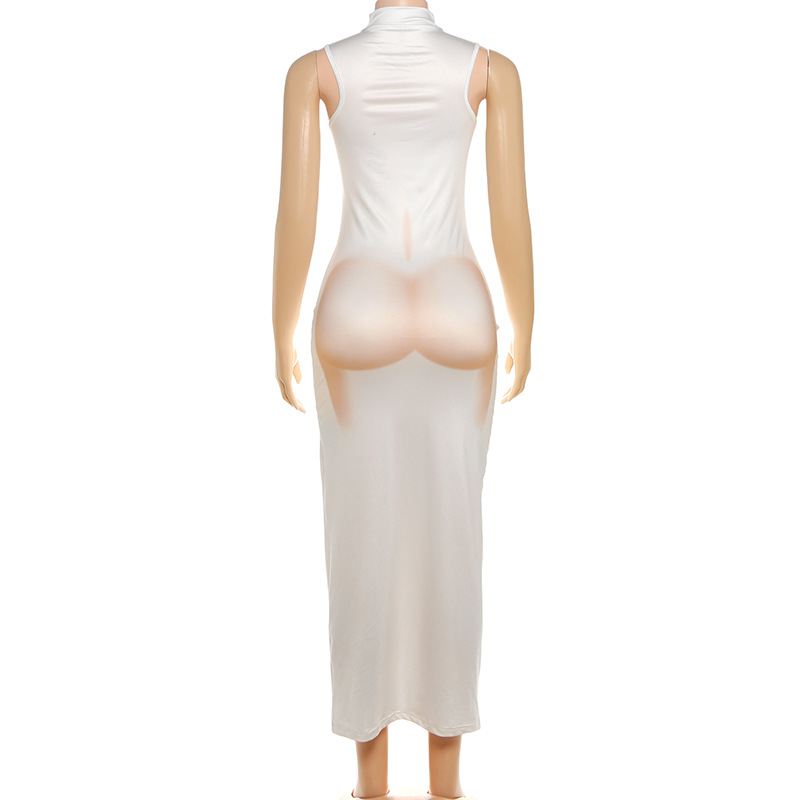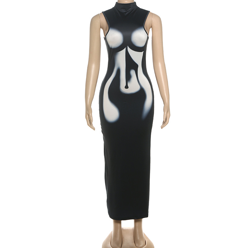 Autumn Winter Women Clothing Sexy Slim Crew Neck Personality Body Print Sleeveless Dress