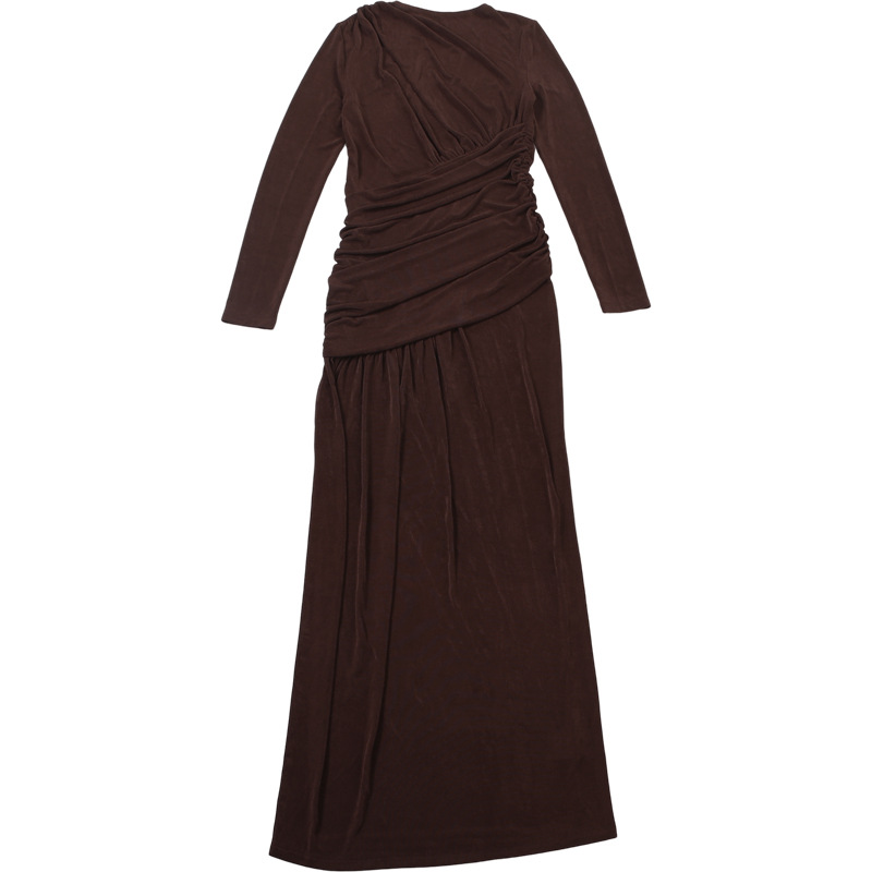 Autumn Winter Women Clothing Solid Color Pleated round Neck Slim Fit Long Sleeved Dress Women