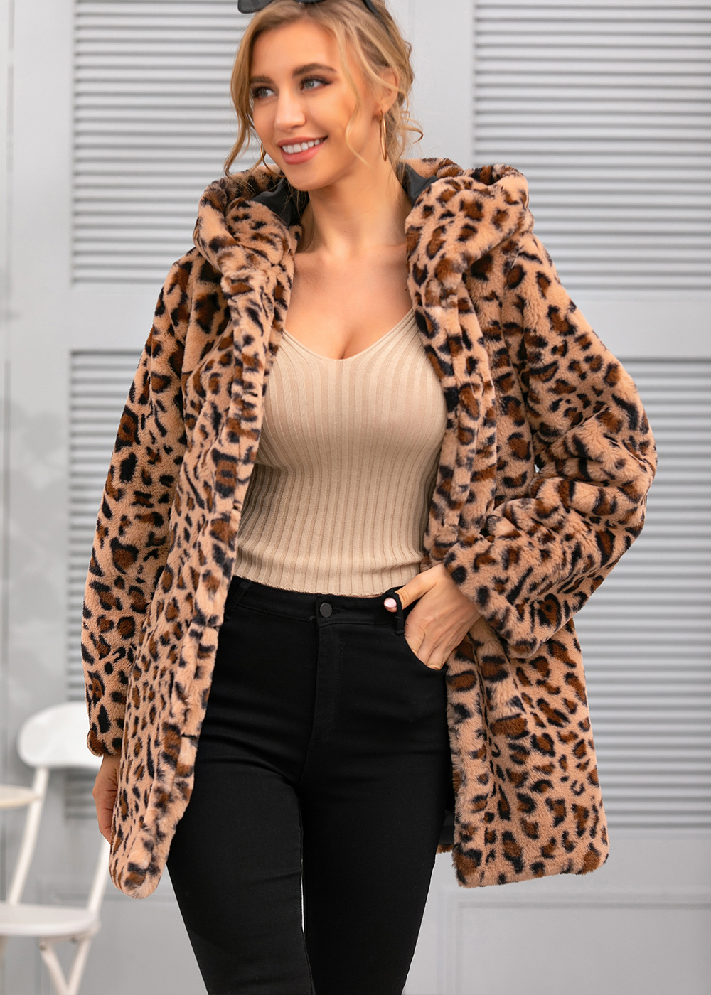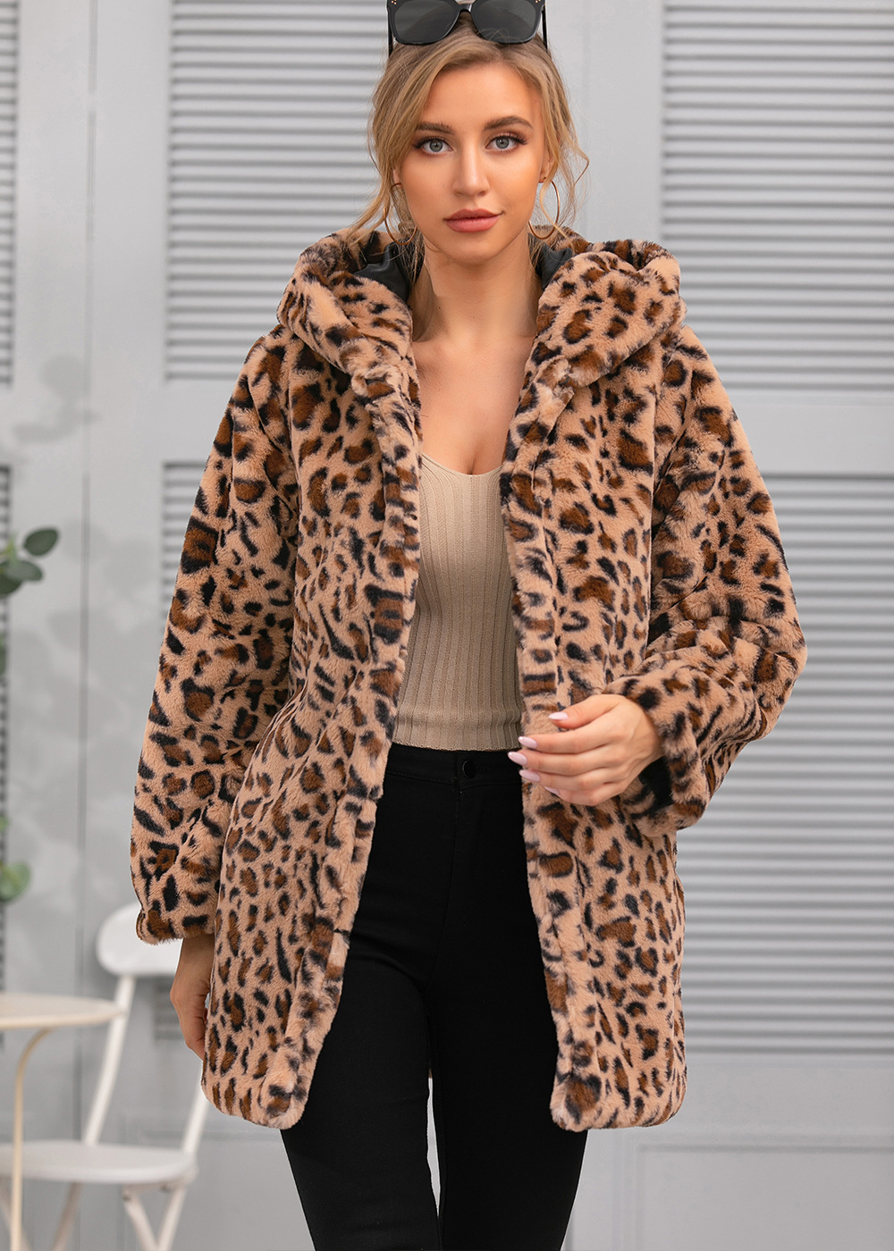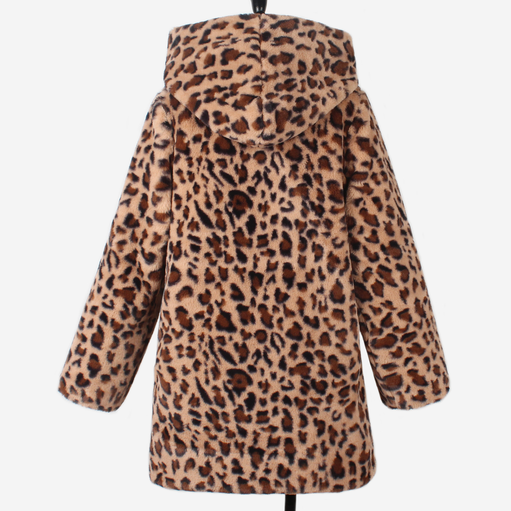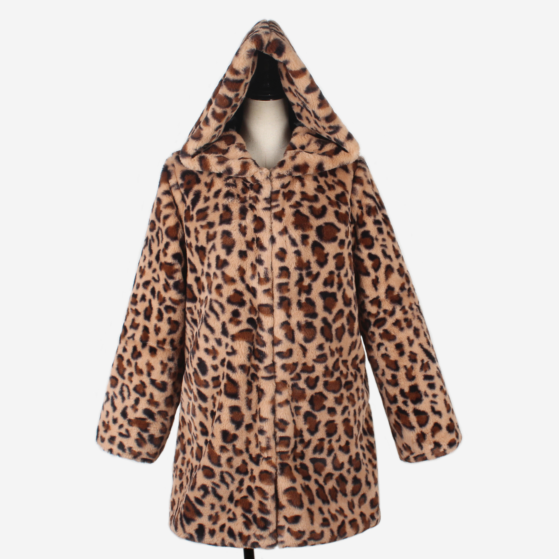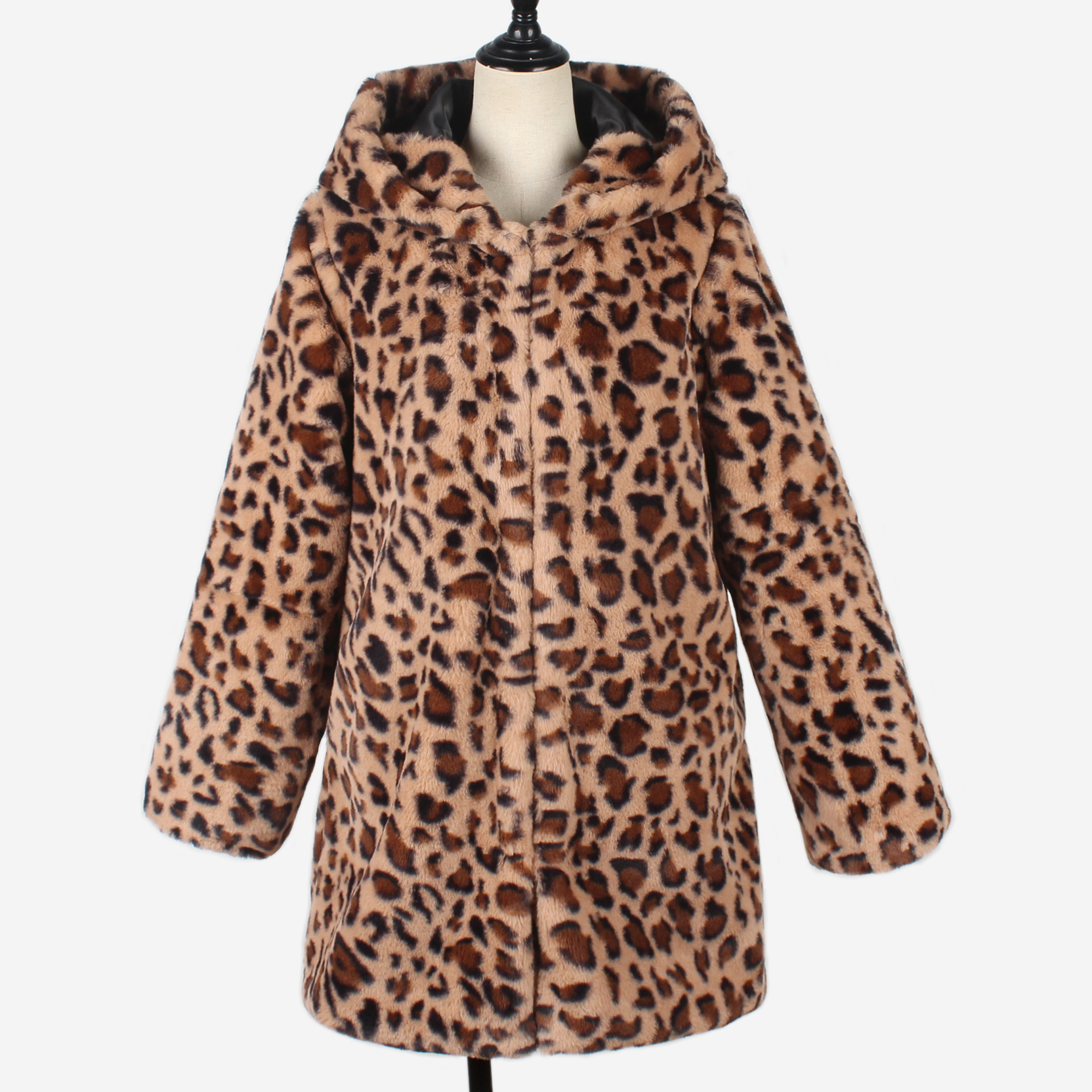 Autumn Winter Women Leopard Print Hooded Short Faux Fur Long Sleeve Jacket