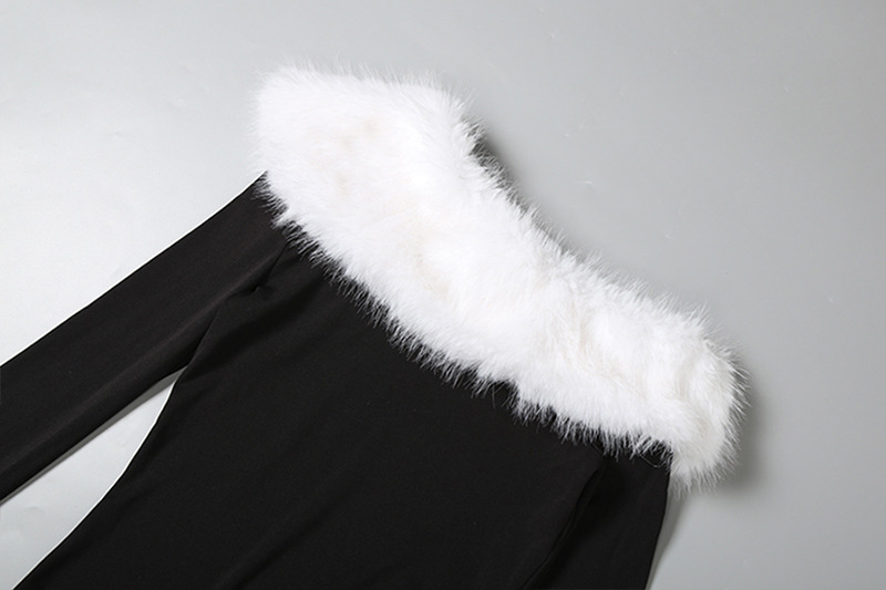 Autumn Winter Women Sexy Fur Collar Stitching Slim Fit Oblique Shoulder Color Matching Long Sleeve Elegant Dress