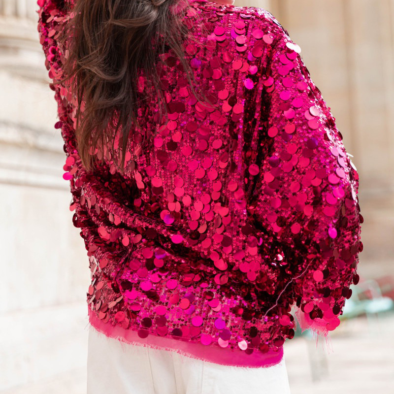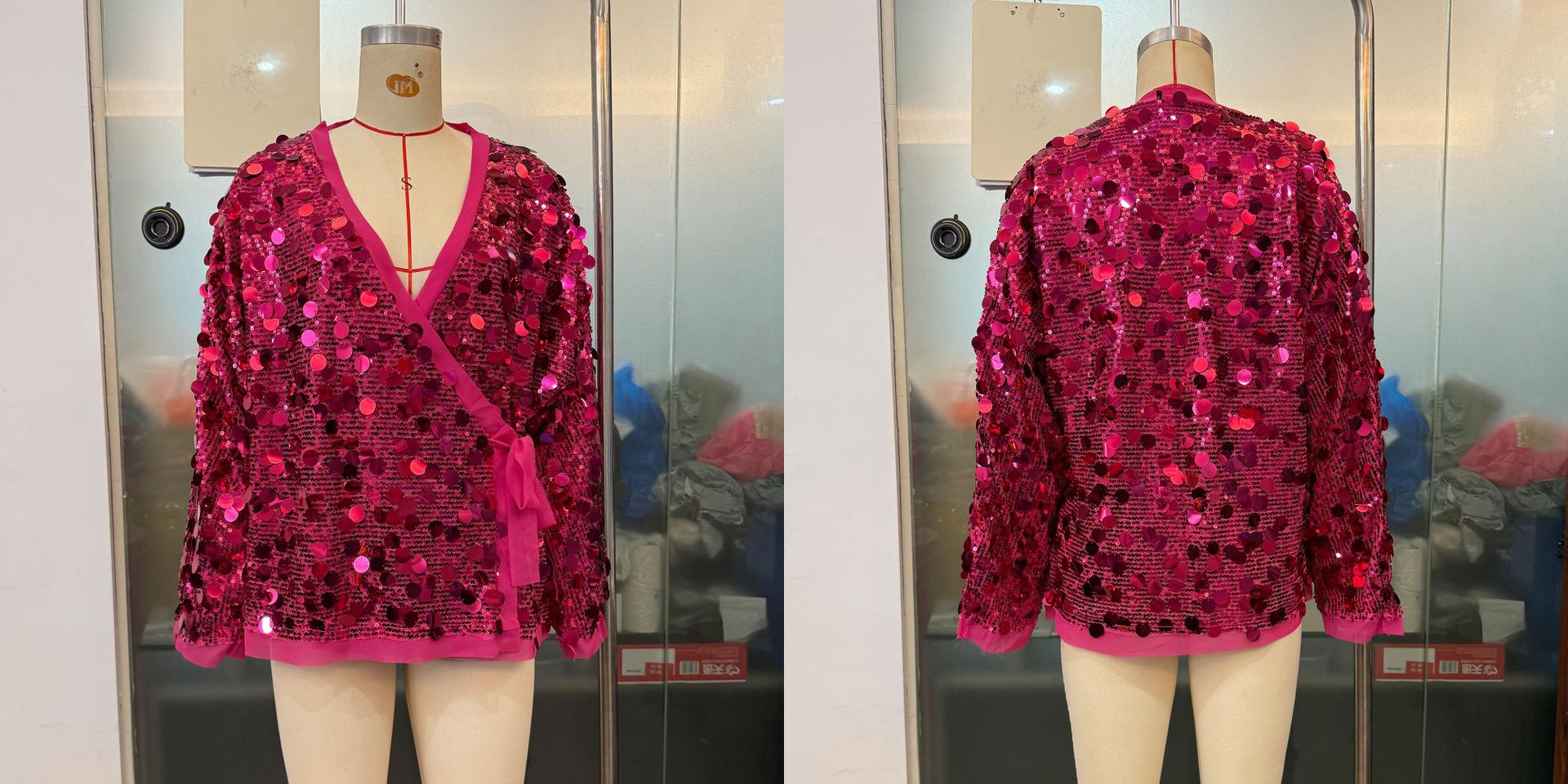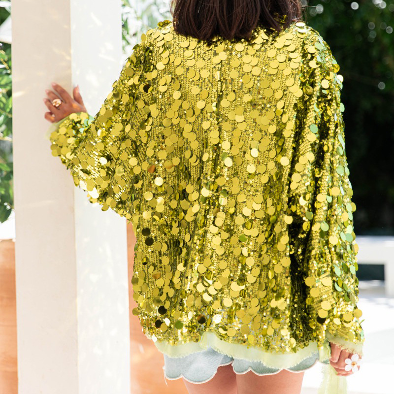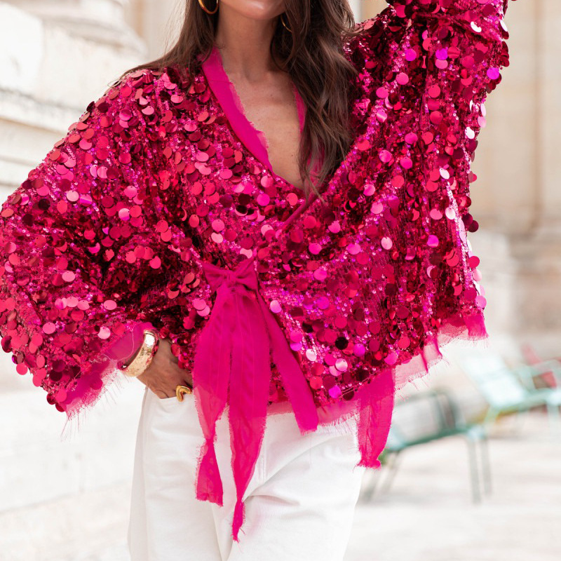 Casual All Match Loose Solid Color Sequ Sequin Lace up Lace up Coat