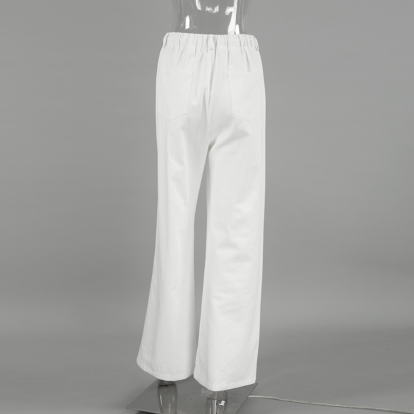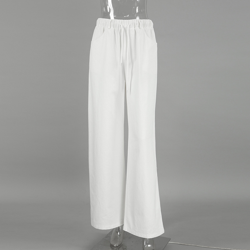 Casual Elegant White Loose Pure Cotton Tied Mid Waist Wide Leg Pants Autumn Winter Classic Trousers