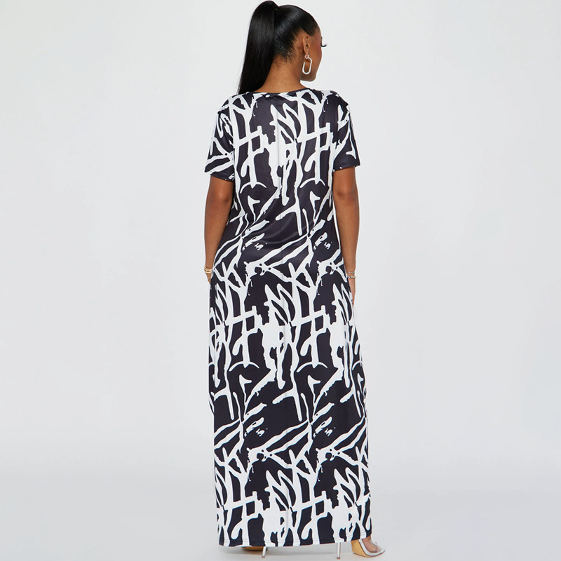 Casual Outing Abstract Printing Black White Short Sleeved Dress Comfortable Home Loose round Neck Jumpsuit