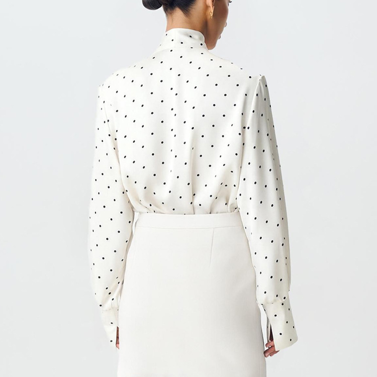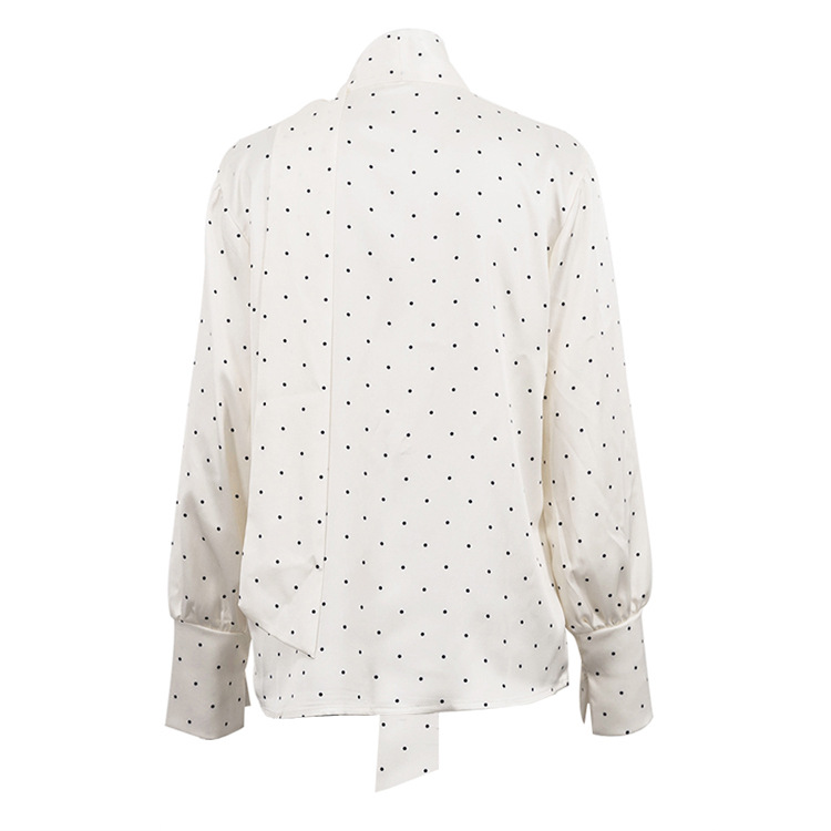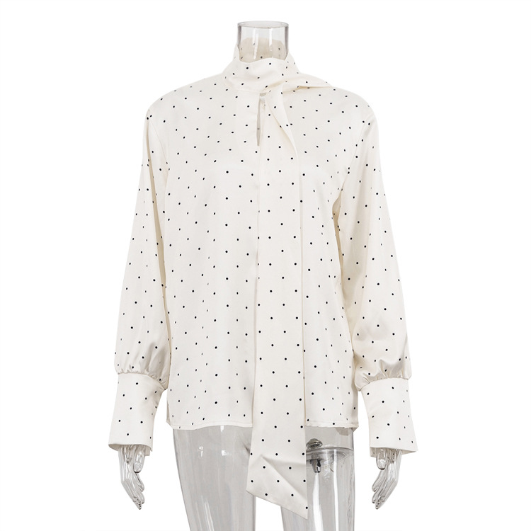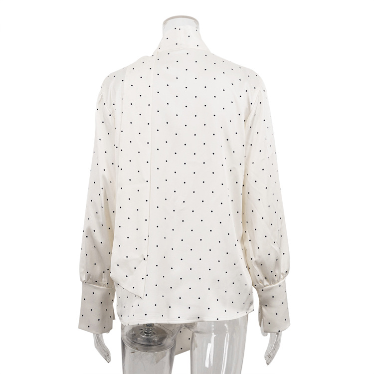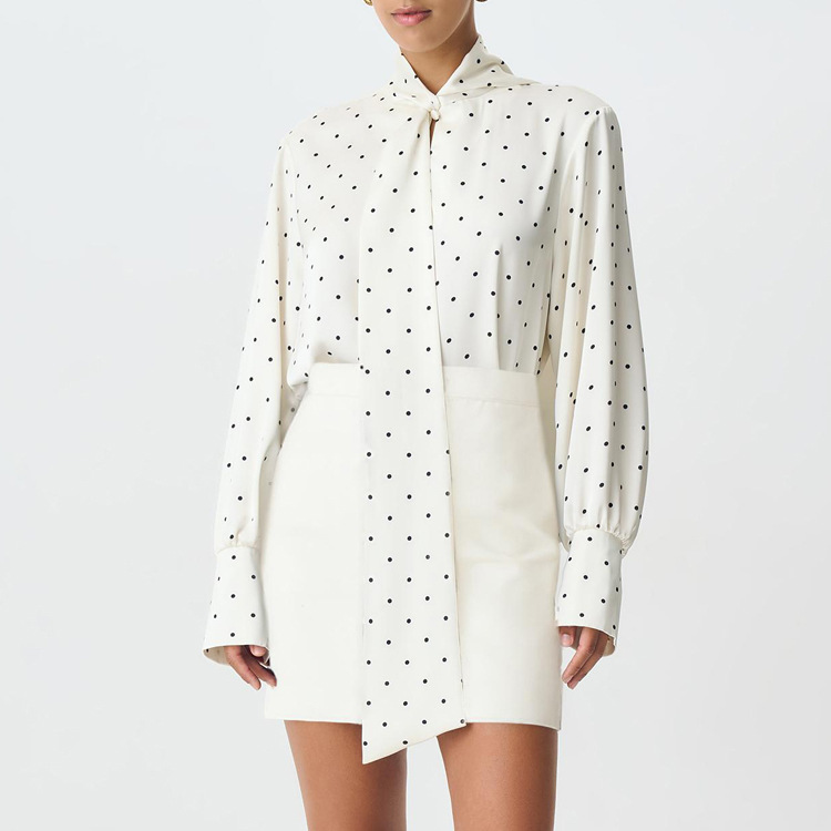 Digital Printing Satin Polka Dot Elegant Top High Grade Long Sleeve Lace up Women Shirt