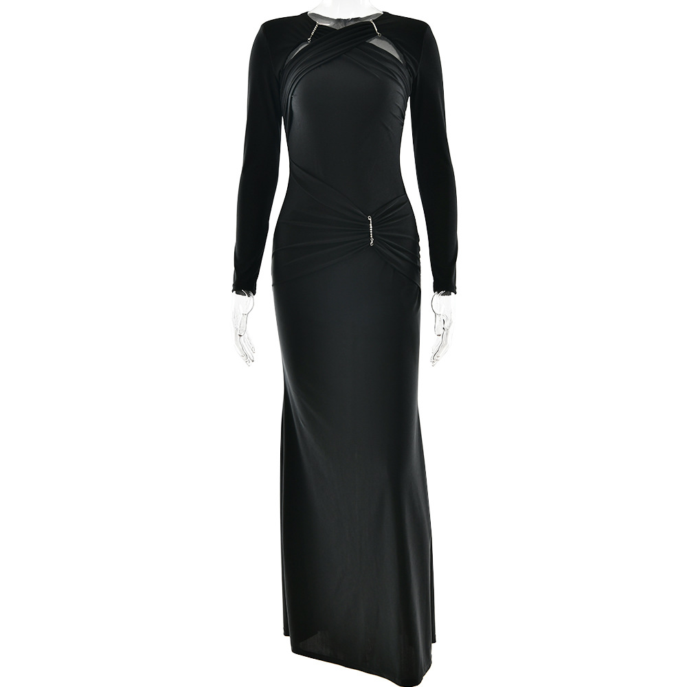 Dress Women round Neck Long Sleeve Sexy Slim Pleated Maxi Dress Elegant Dress