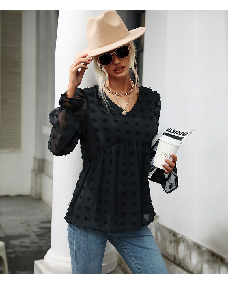 Early Autumn Tops Thin Loose Fitting V neck Long Sleeves Black Shirt