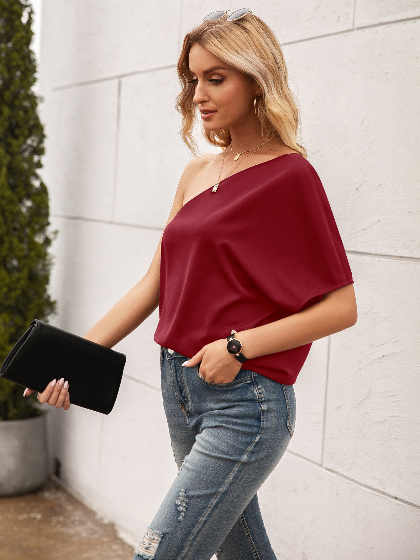 Elegant Simple Fashionable Casual Diagonal Collar Short Sleeved Top for Women