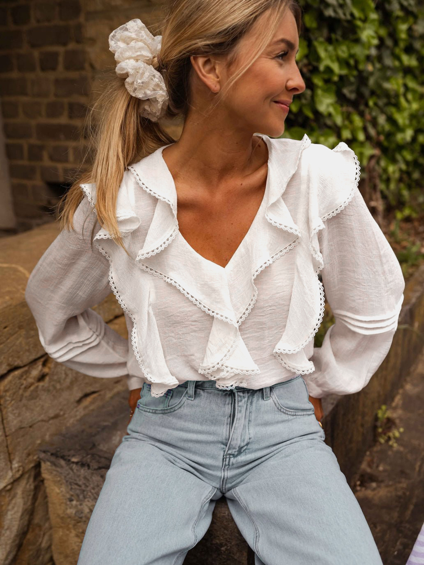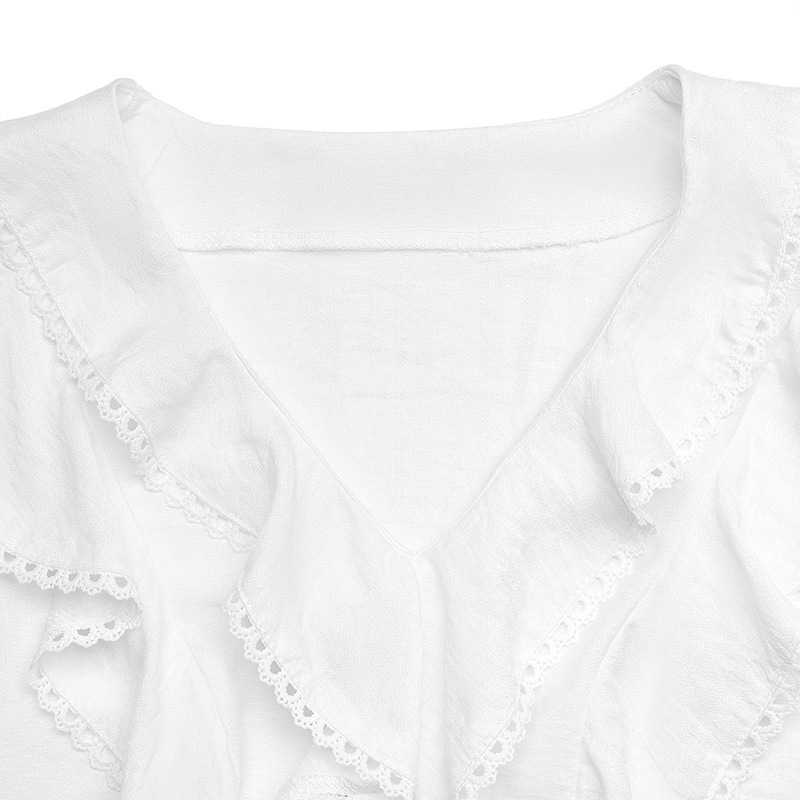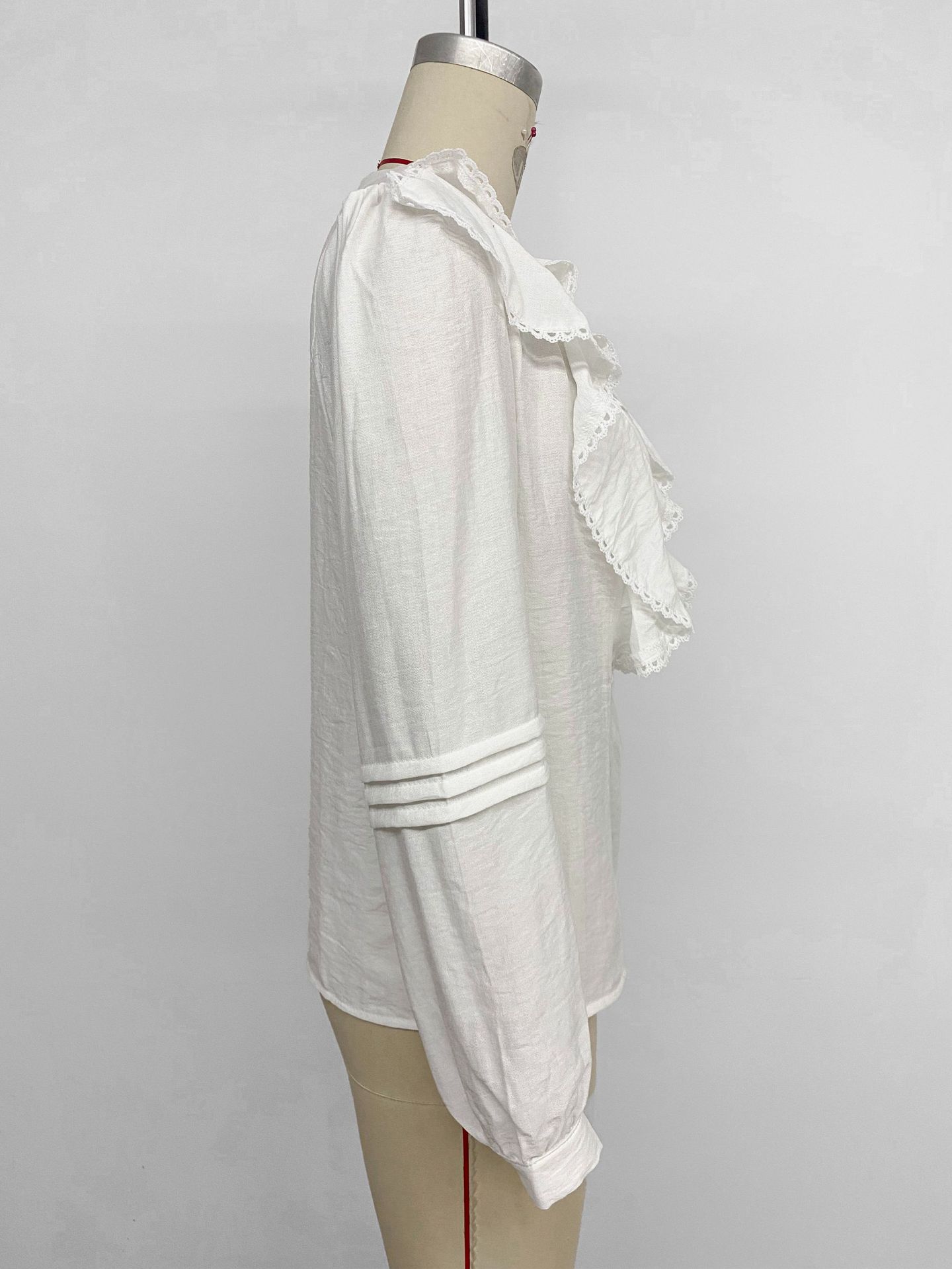 Fall French Pastoral Top Lace Ruffled V neck White Shirt Women