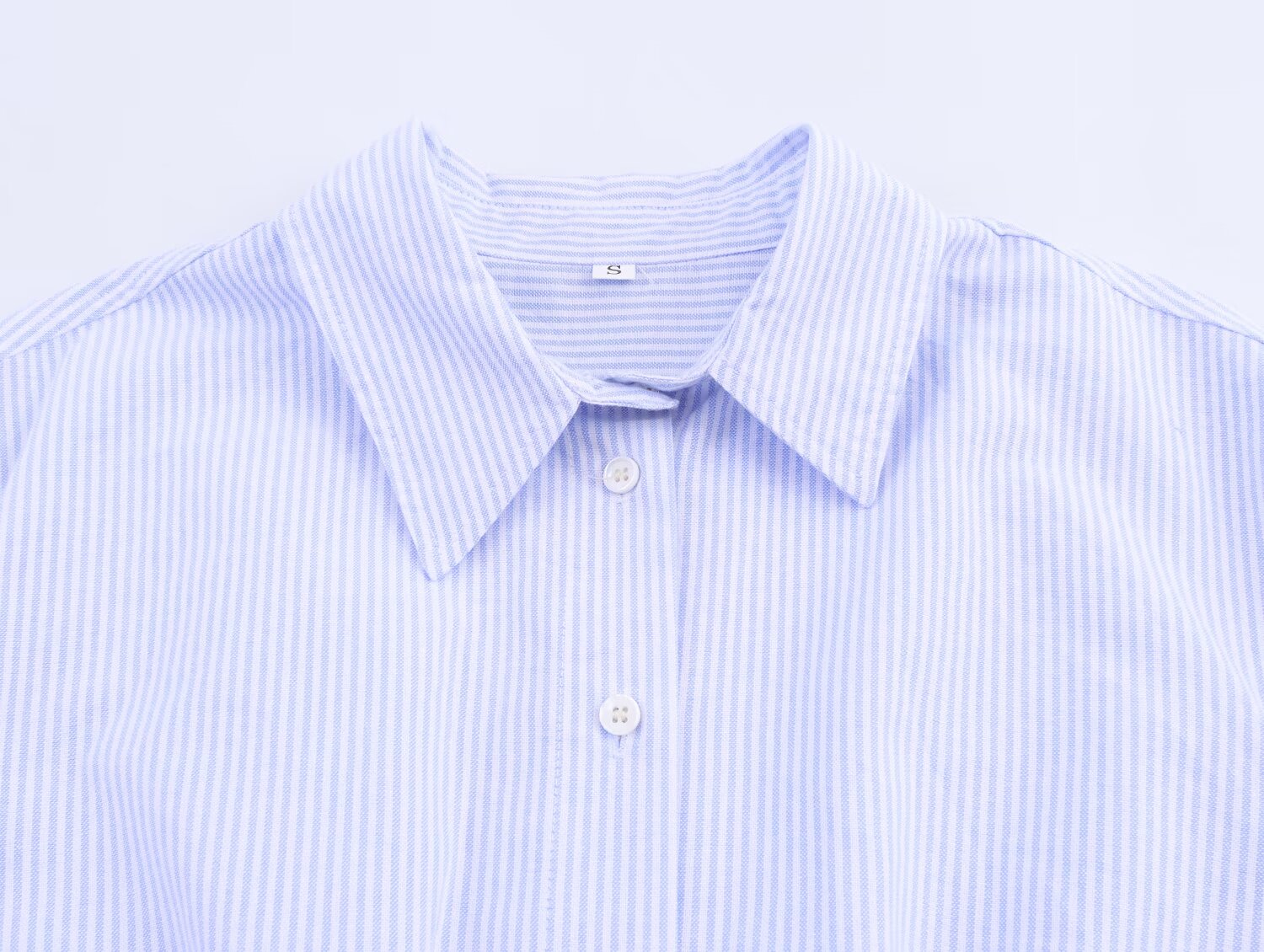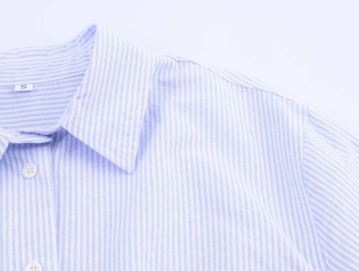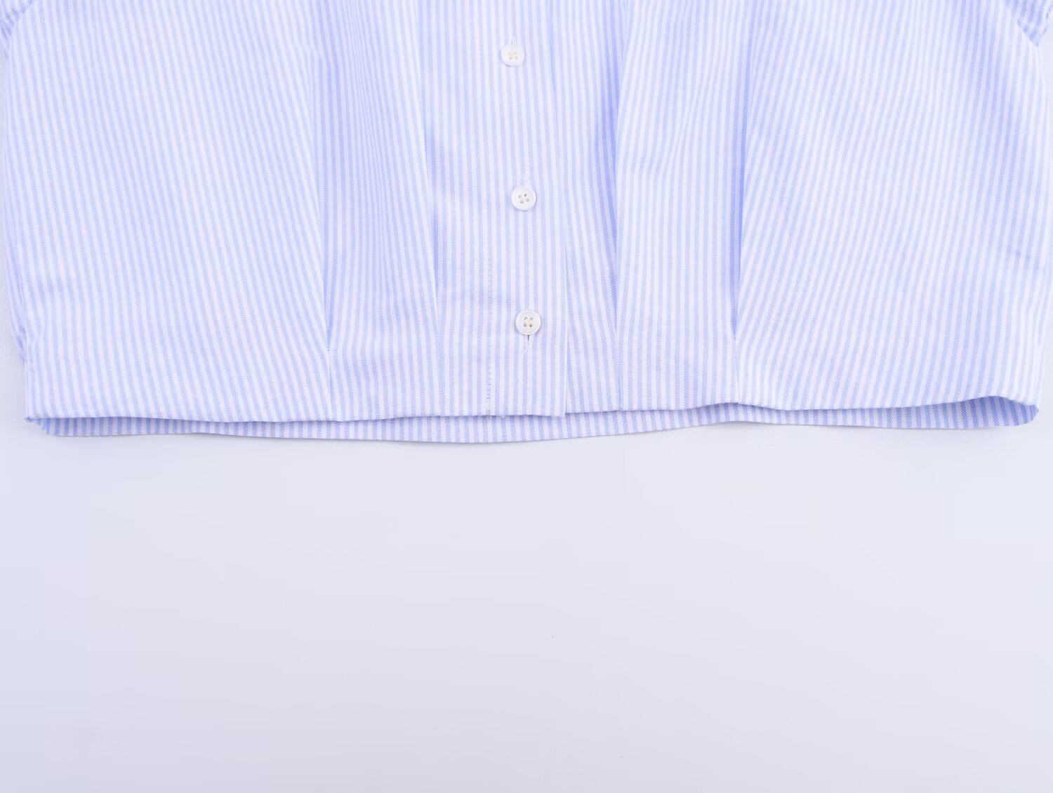 Fall Women Clothing Casual Slimming Fashionable All Match Waist Pleated Striped Short Shirt