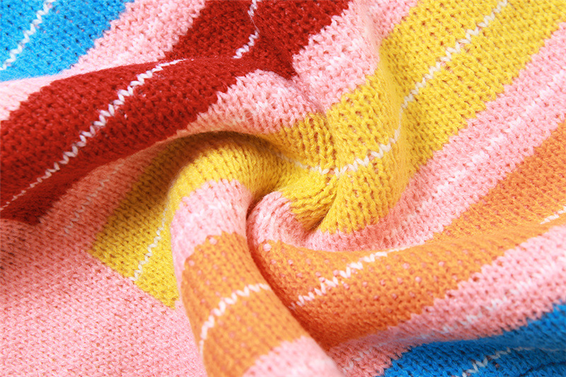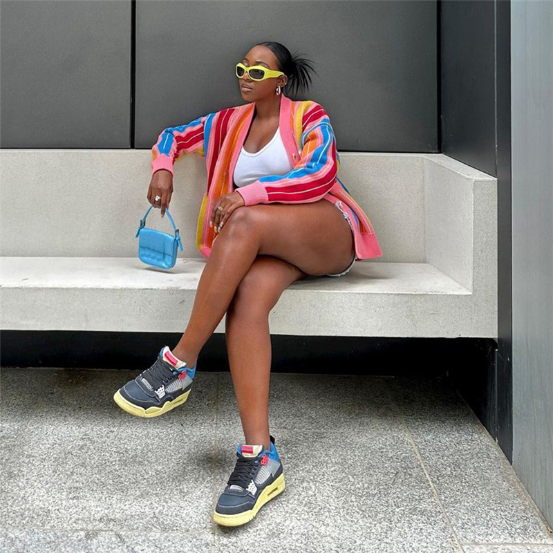 Fall Women Clothing Color Contrast Knitted Striped Long Sleeve Cardigan Loose Casual Top