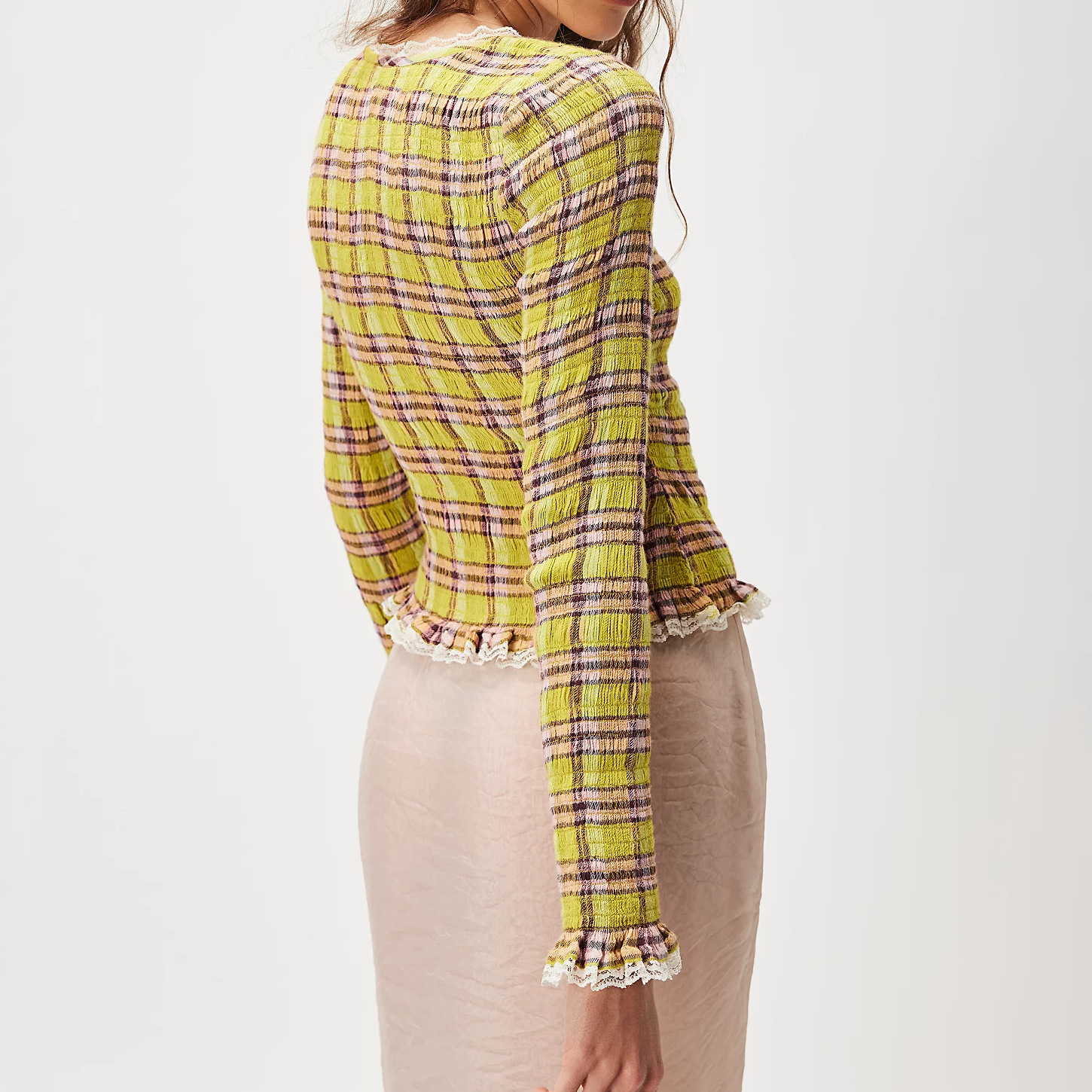 Fall Women Clothing Wild Lace Plaid Slim Fit Buttoned Long Sleeved Top