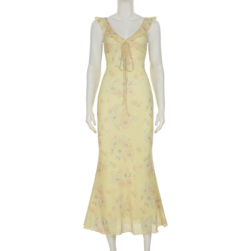 French Holiday Floral Strap Dress Ruffled Gentle Sexy Flying Sleeve Maxi Dress for Women