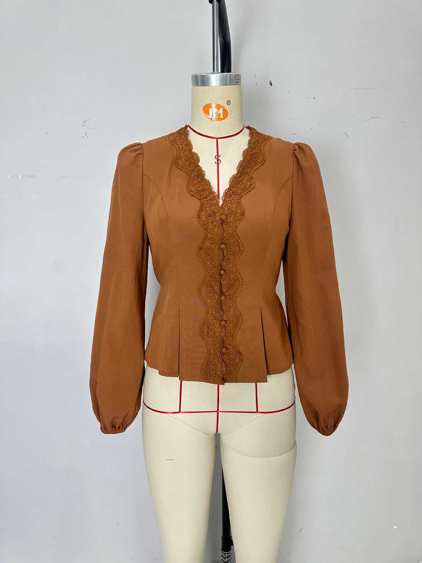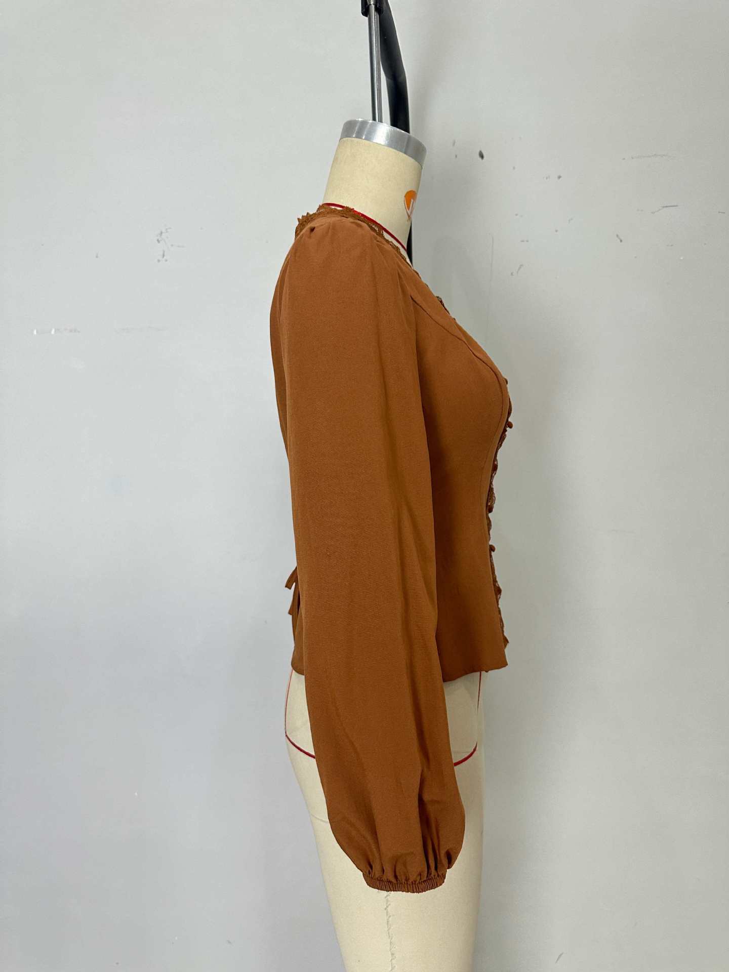 French Lace Lace Long Sleeved Shirt Autumn V neck Pleated Lace up Waist Single Row Multi Buckle Top