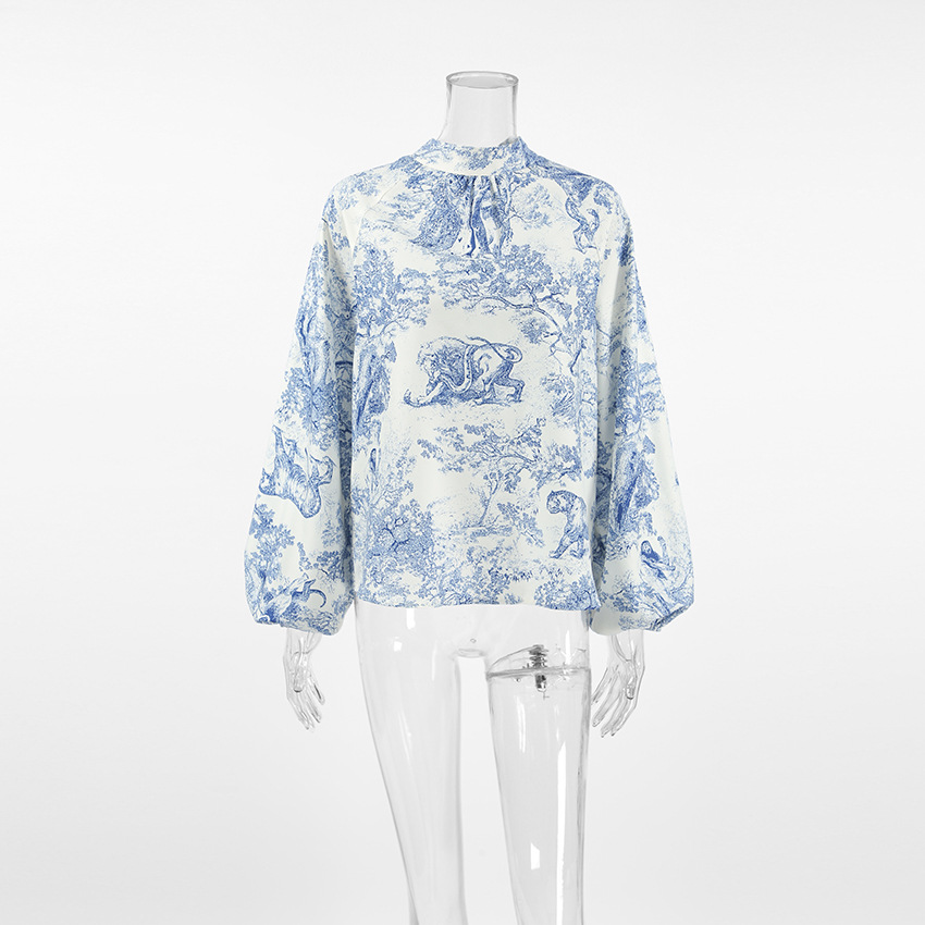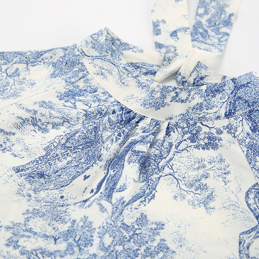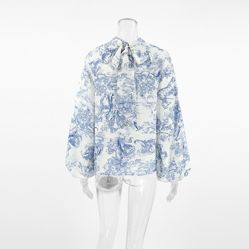 French Loose Lantern Sleeve Tie Neck Printed Women Lace up Shirt Autumn Top