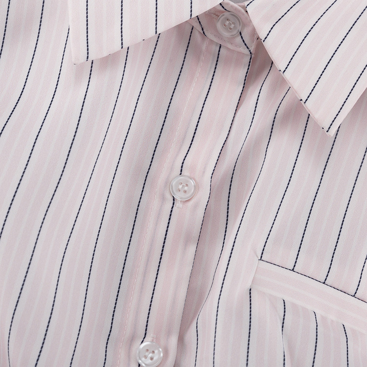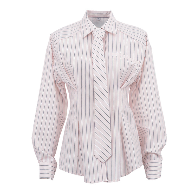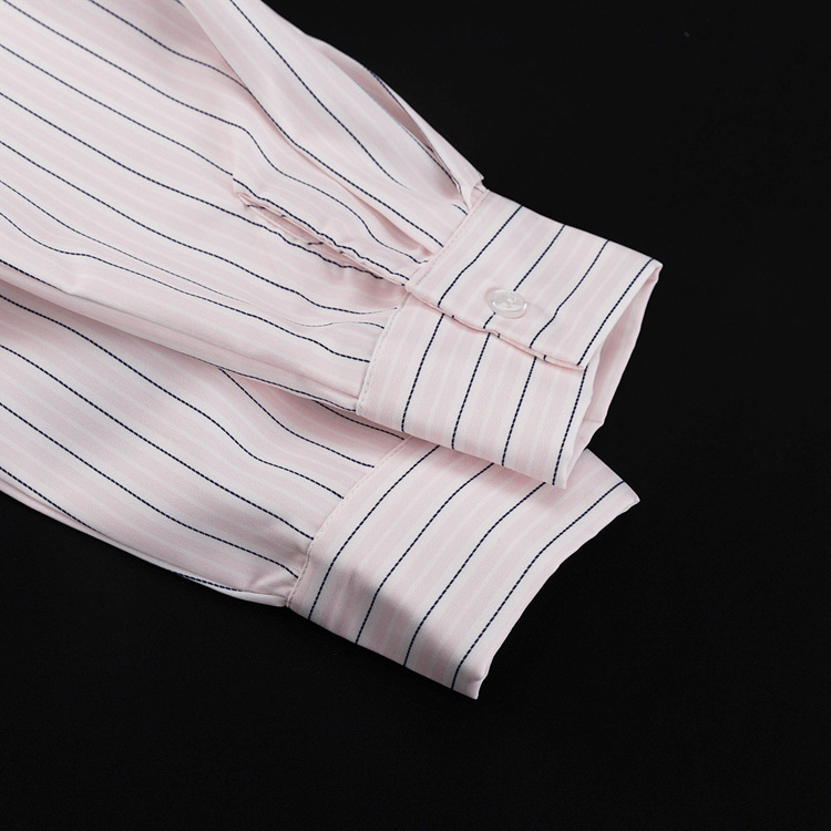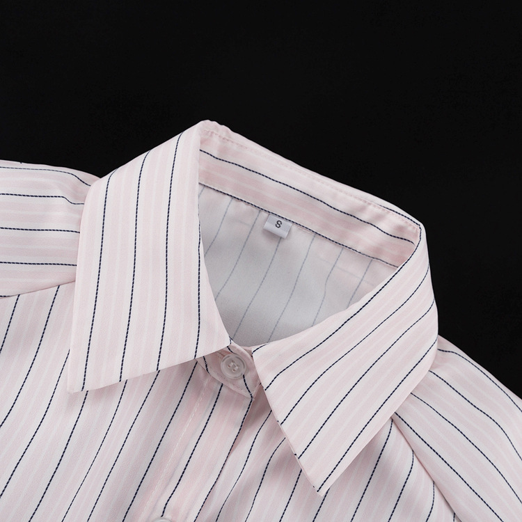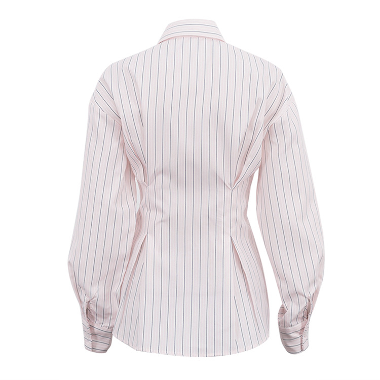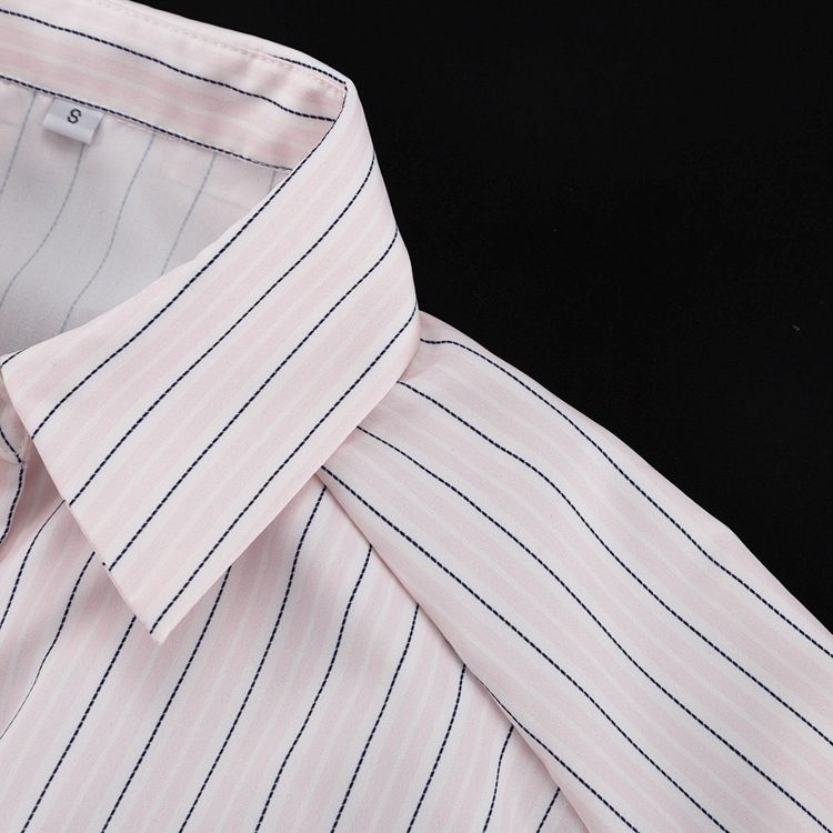 Office Printed Striped Shirt Women Polo Collar Long Sleeve Tie Cinched Blouse