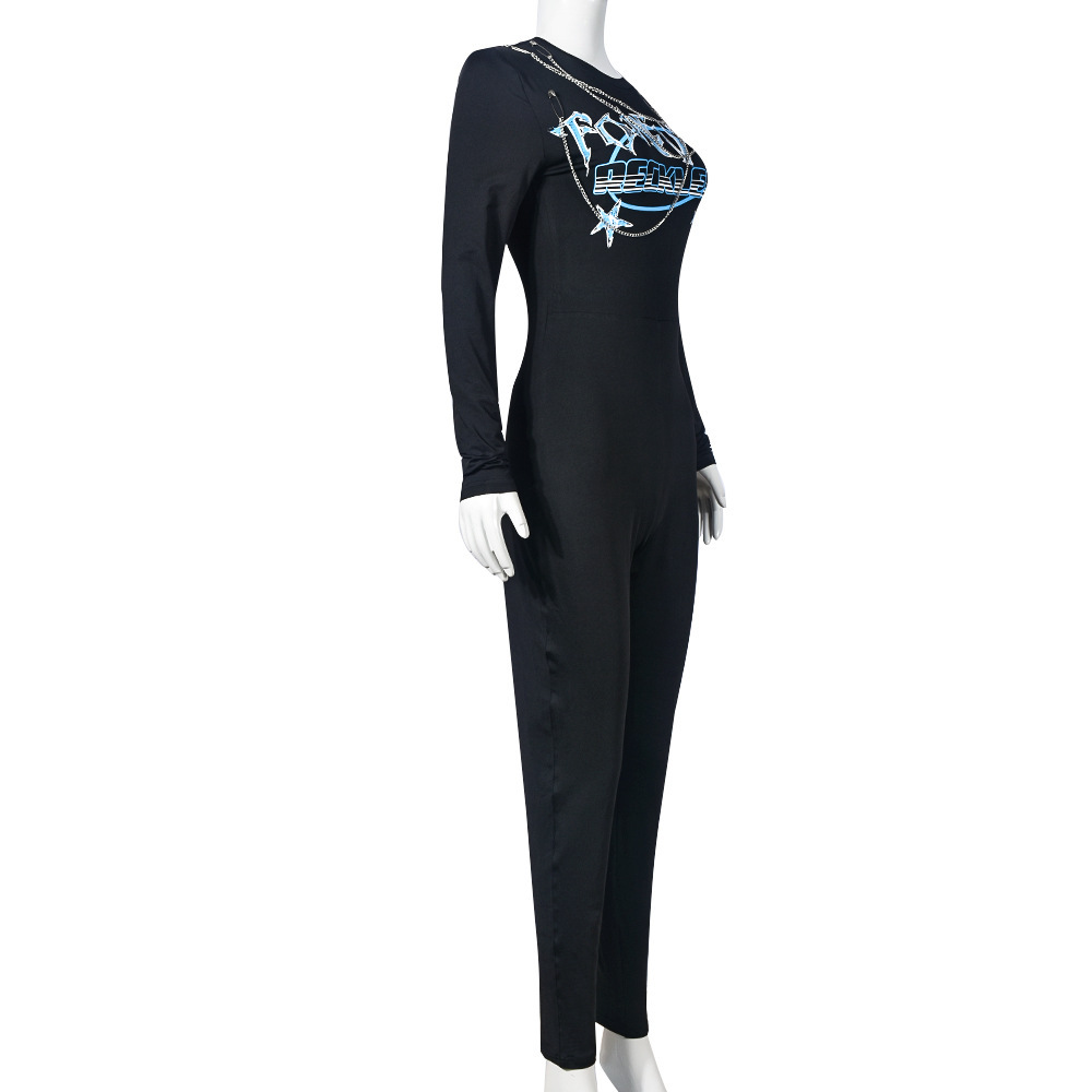 One Piece Women Clothing Print round Neck Long Sleeve Stretchy Slim Fit Tight Jumpsuit