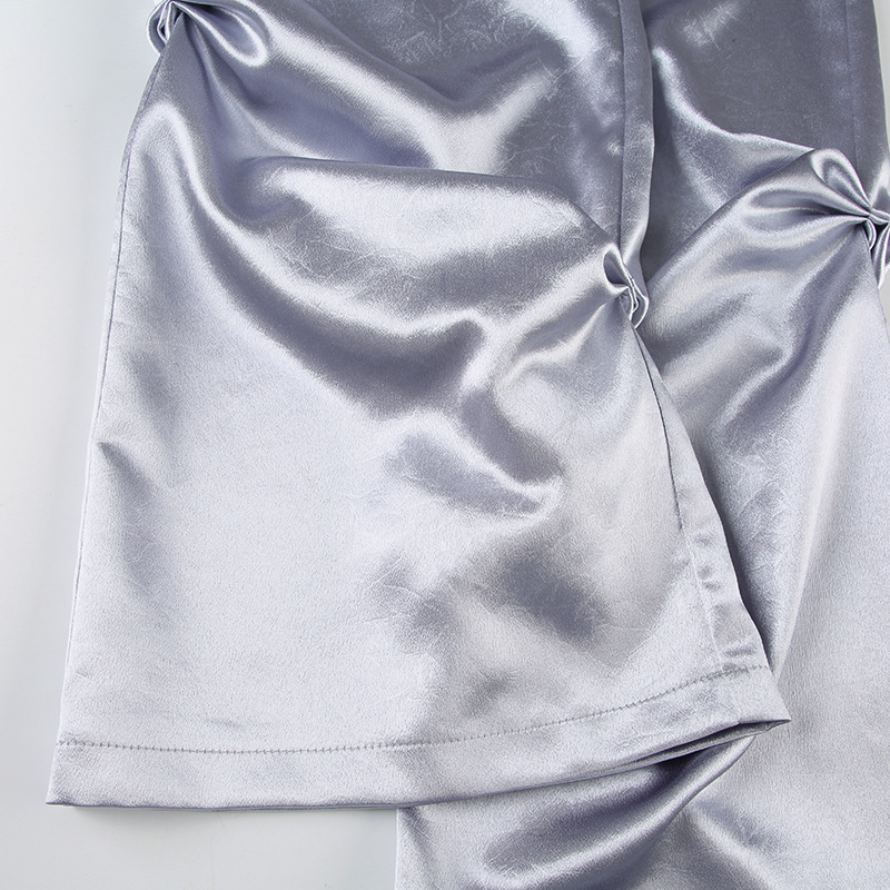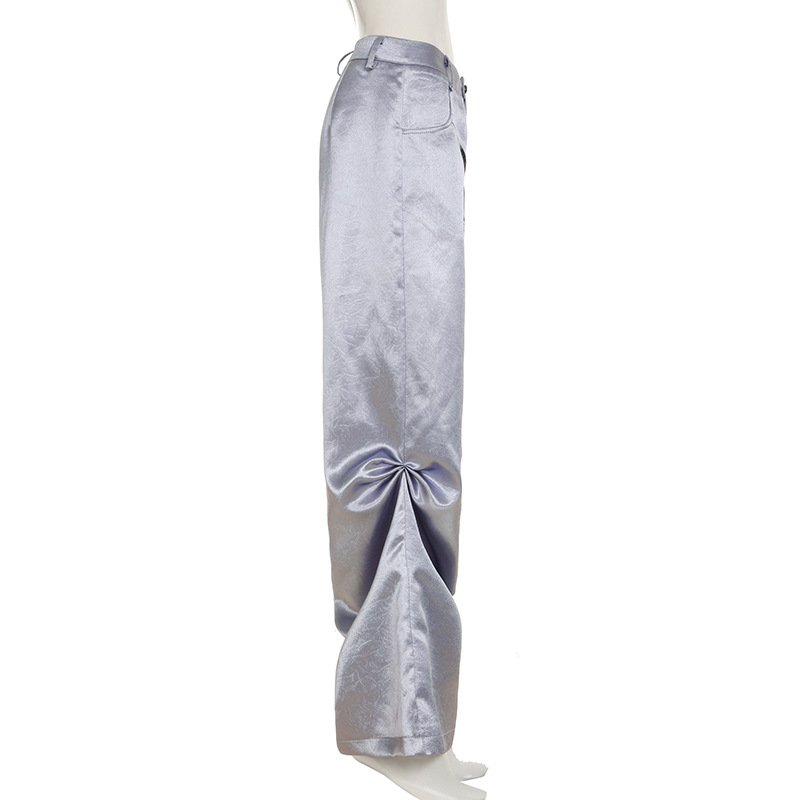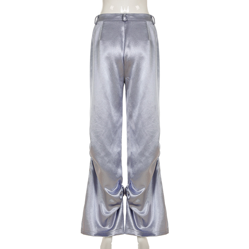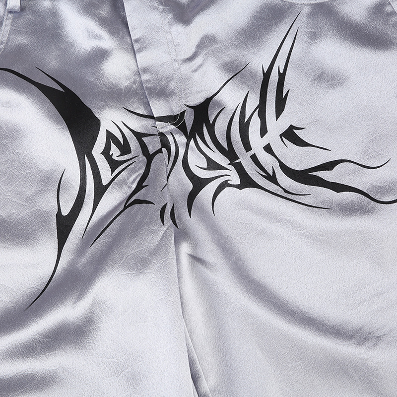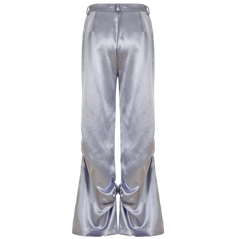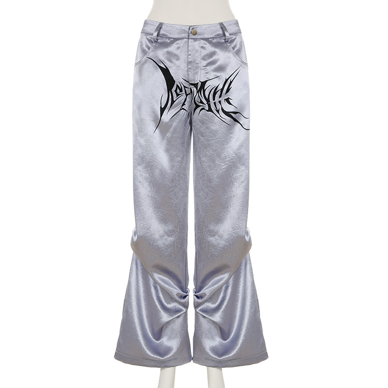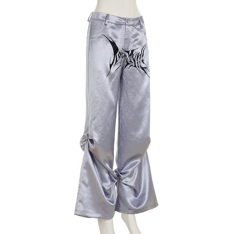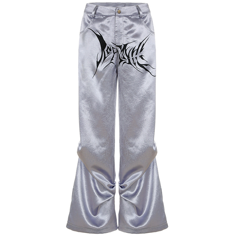 Personality Street Trendy Cool Loose Wide Leg Pants Satin Pleated Design Print High Waist Casual Trousers
