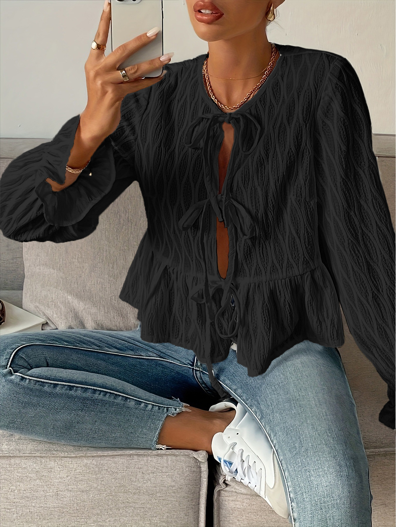 Popular Long Sleeved Lace up Casual Women Tops