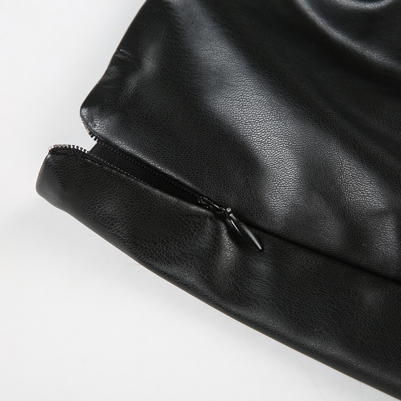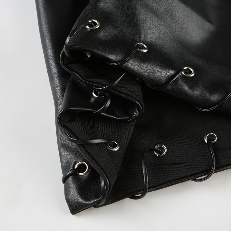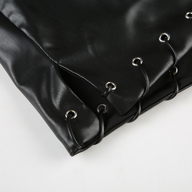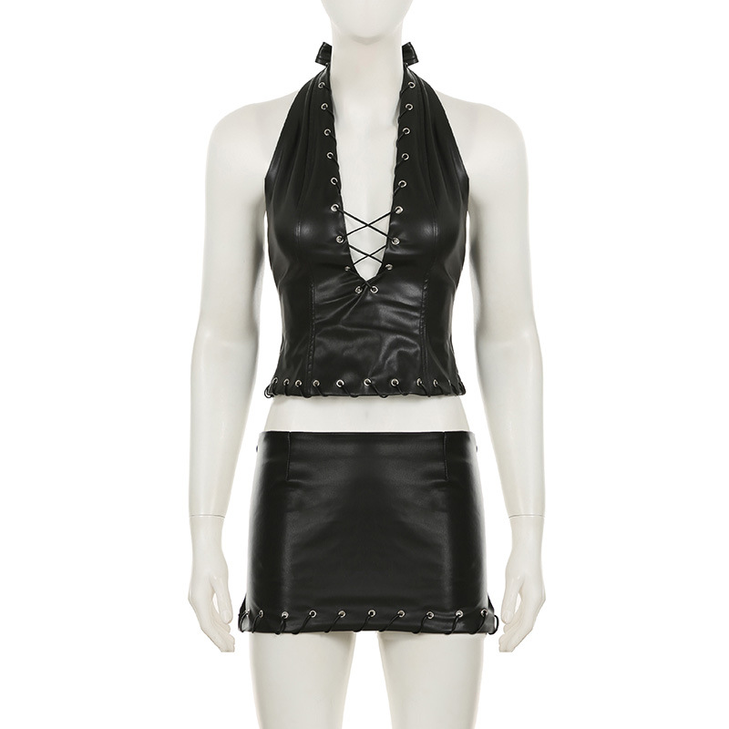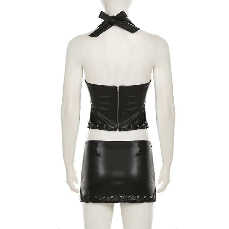 Punk Leather Suit Sexy Cutout Halterneck Vest Corns Lace up Vest Skirt Two Piece Sets Women