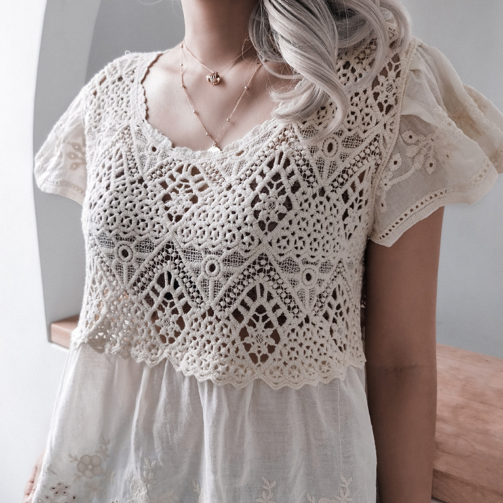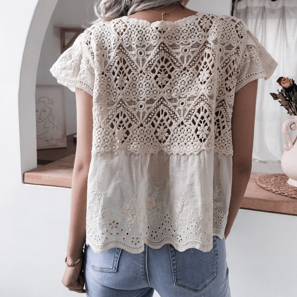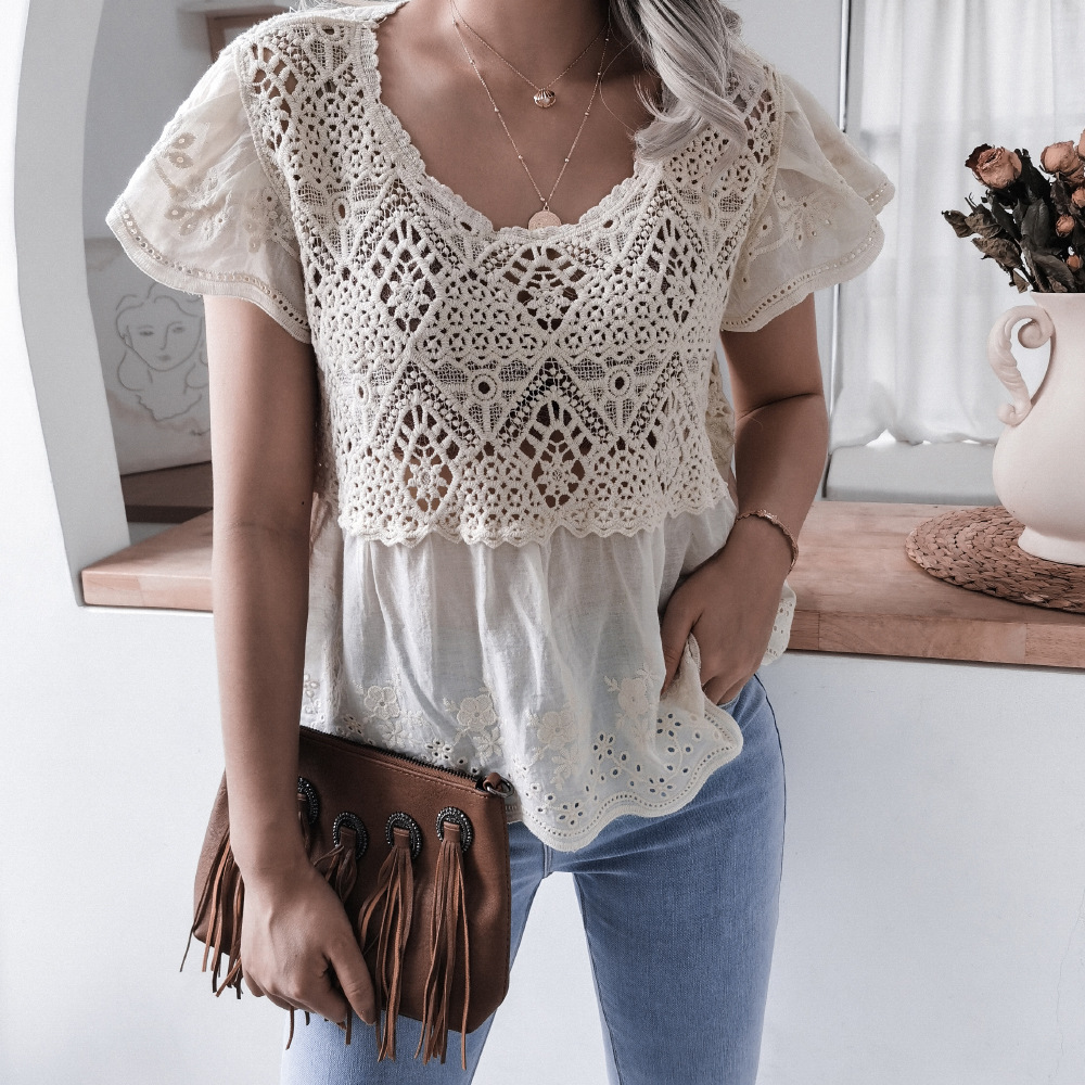 Real Shot Casual Embroidery Ruffled Short Sleeves V-neck Crocheted Hollow Out Cutout Lace Shirt Peplum Top