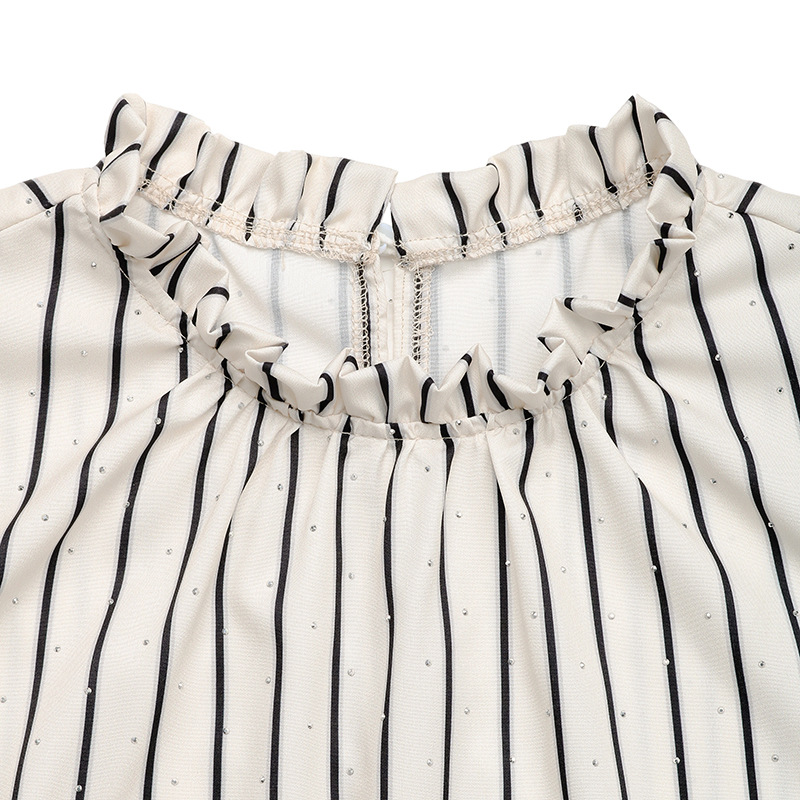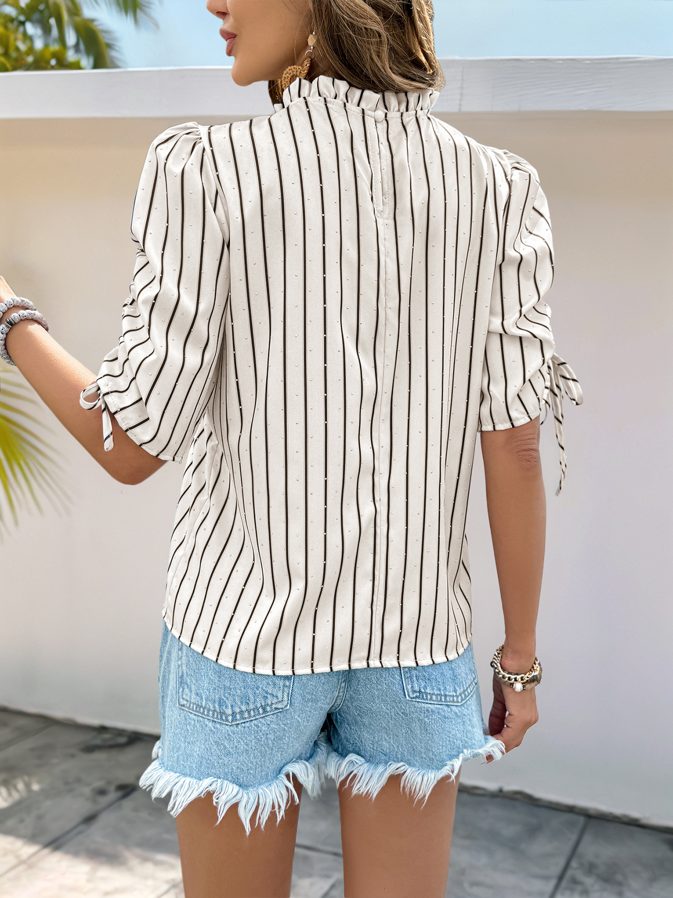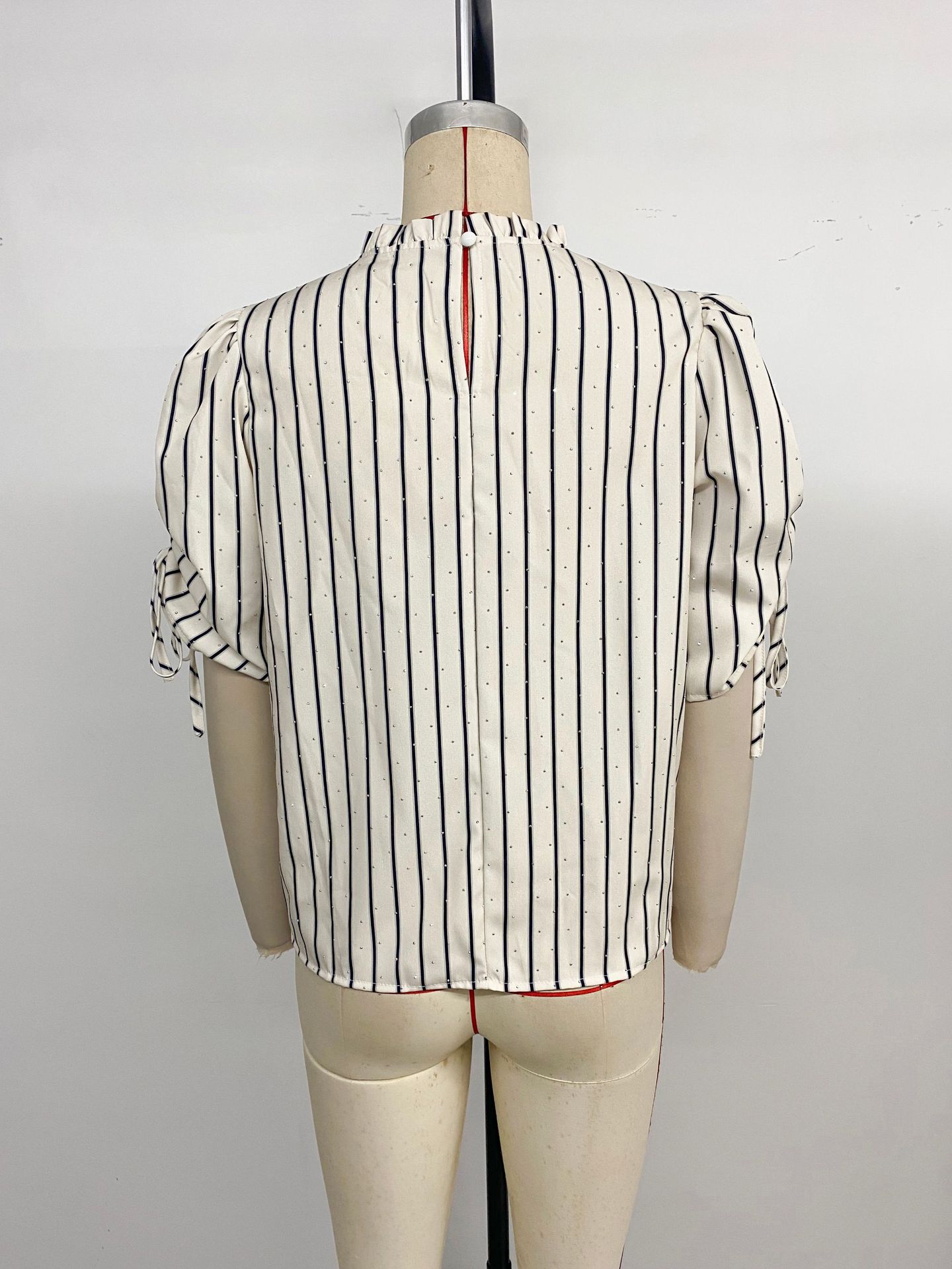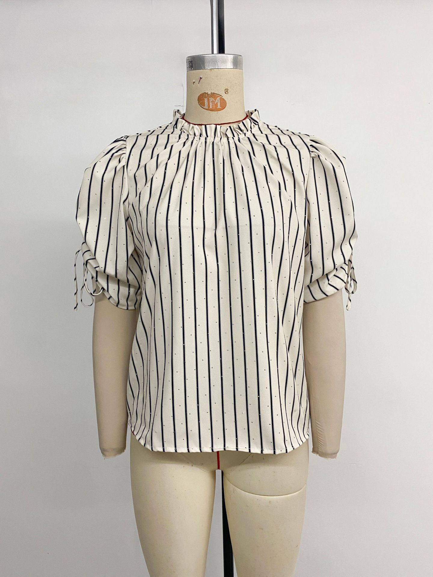 Retro Stand Collar Striped Drawstring Puff Short Sleeve Shirt Women Summer