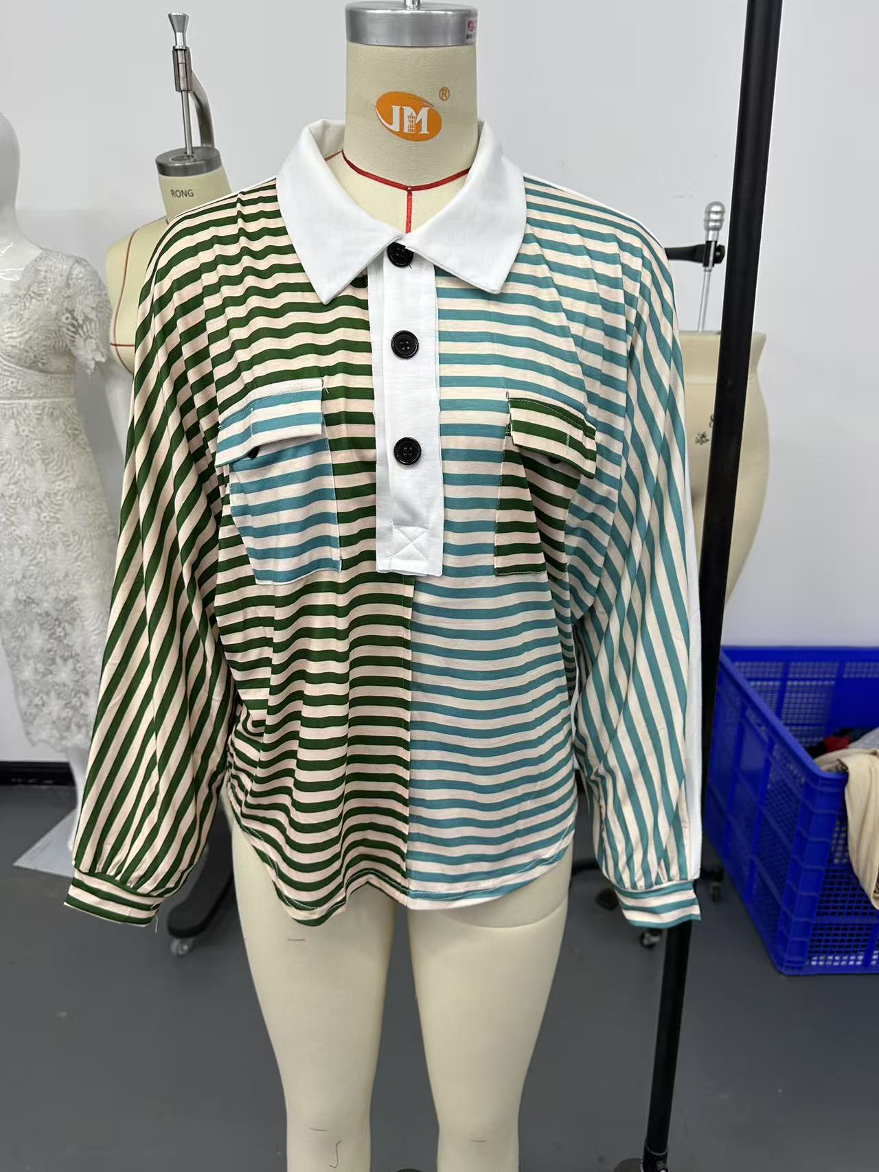 Retro Street Idle Loose Striped Polo Shirt Pullover Long Sleeve Top