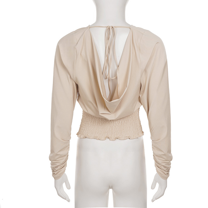 Retro Swing Collar Backless Slim Fit Long Sleeved T shirt Women Waist Tight Solid Color All Matching Basic Top