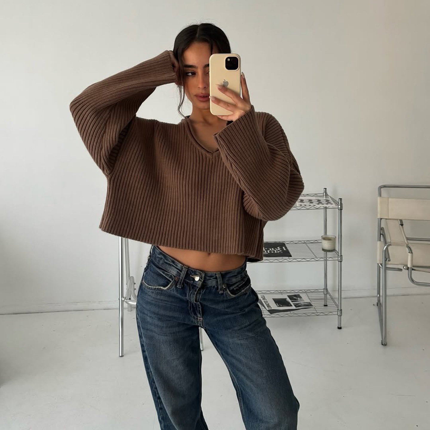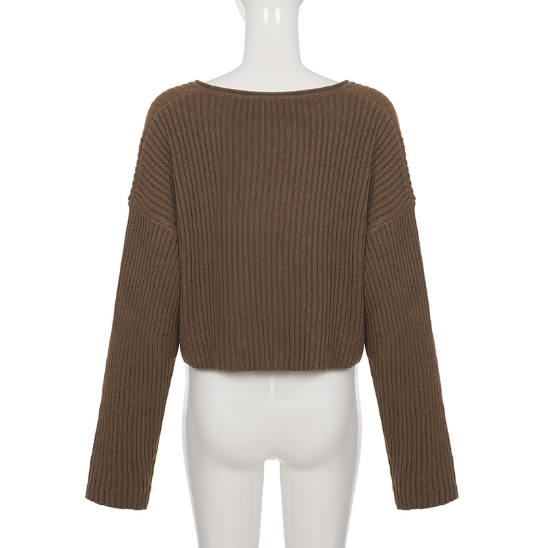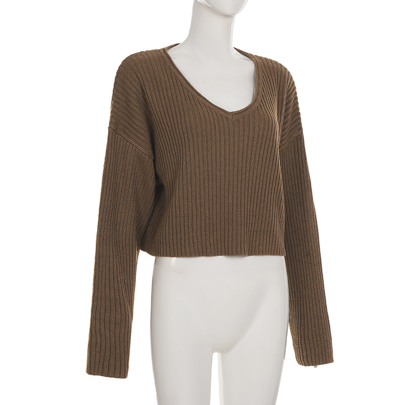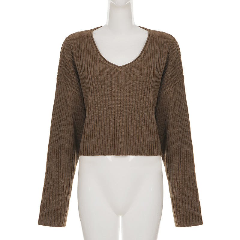 Retro V neck Sunken Stripe Solid Color Sweater Women Autumn Winter Maillard Fashionable Loose All Match Top