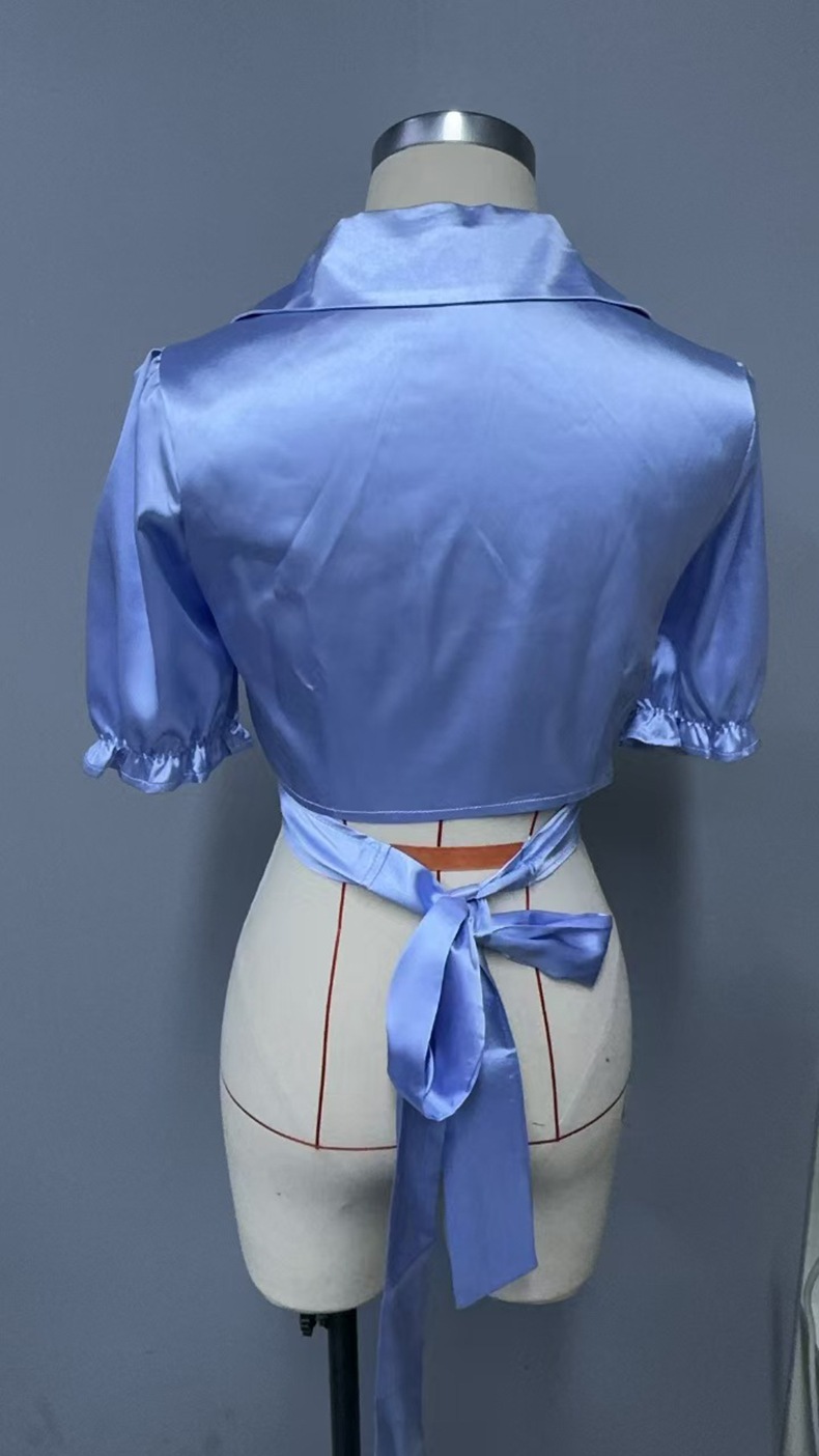 Satin Silk like Puff Sleeve Ultra Short Top Peter Pan Collar Short Sleeve Shirt for Women