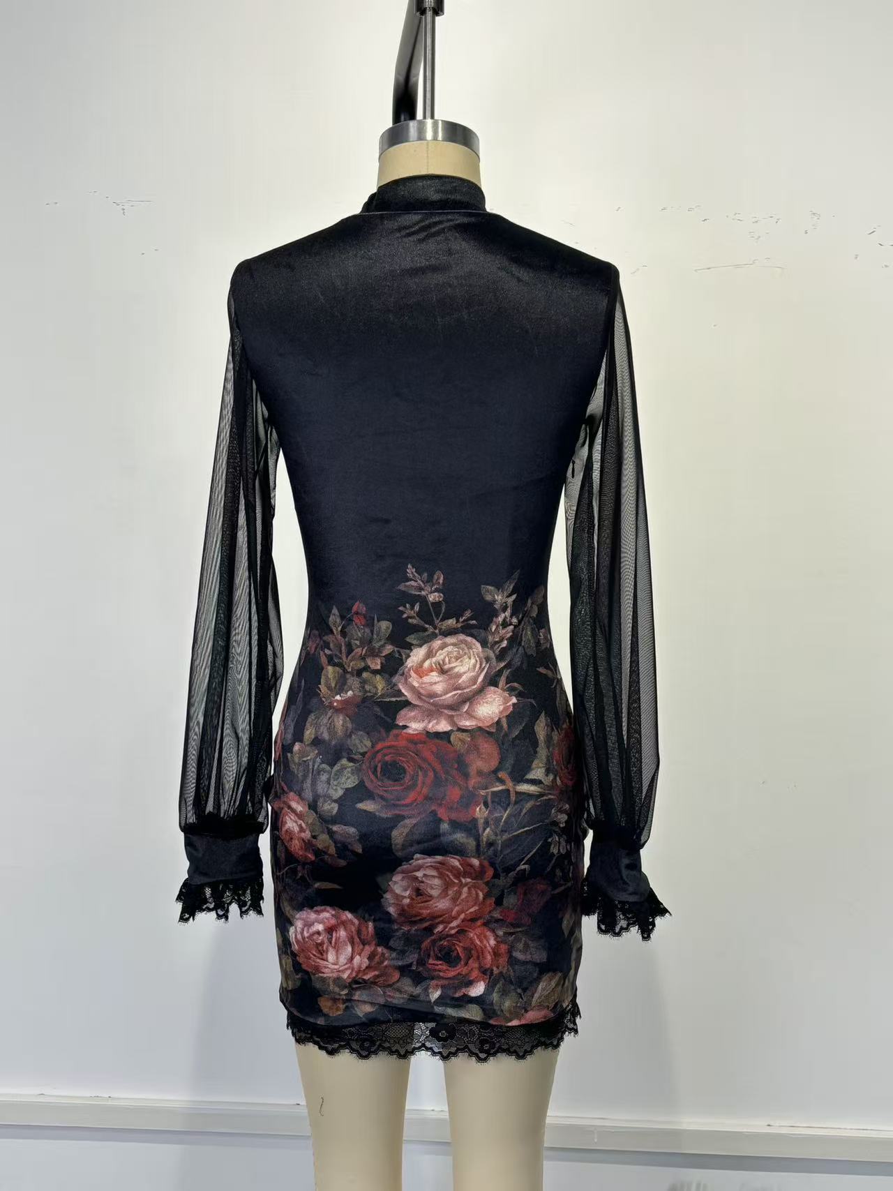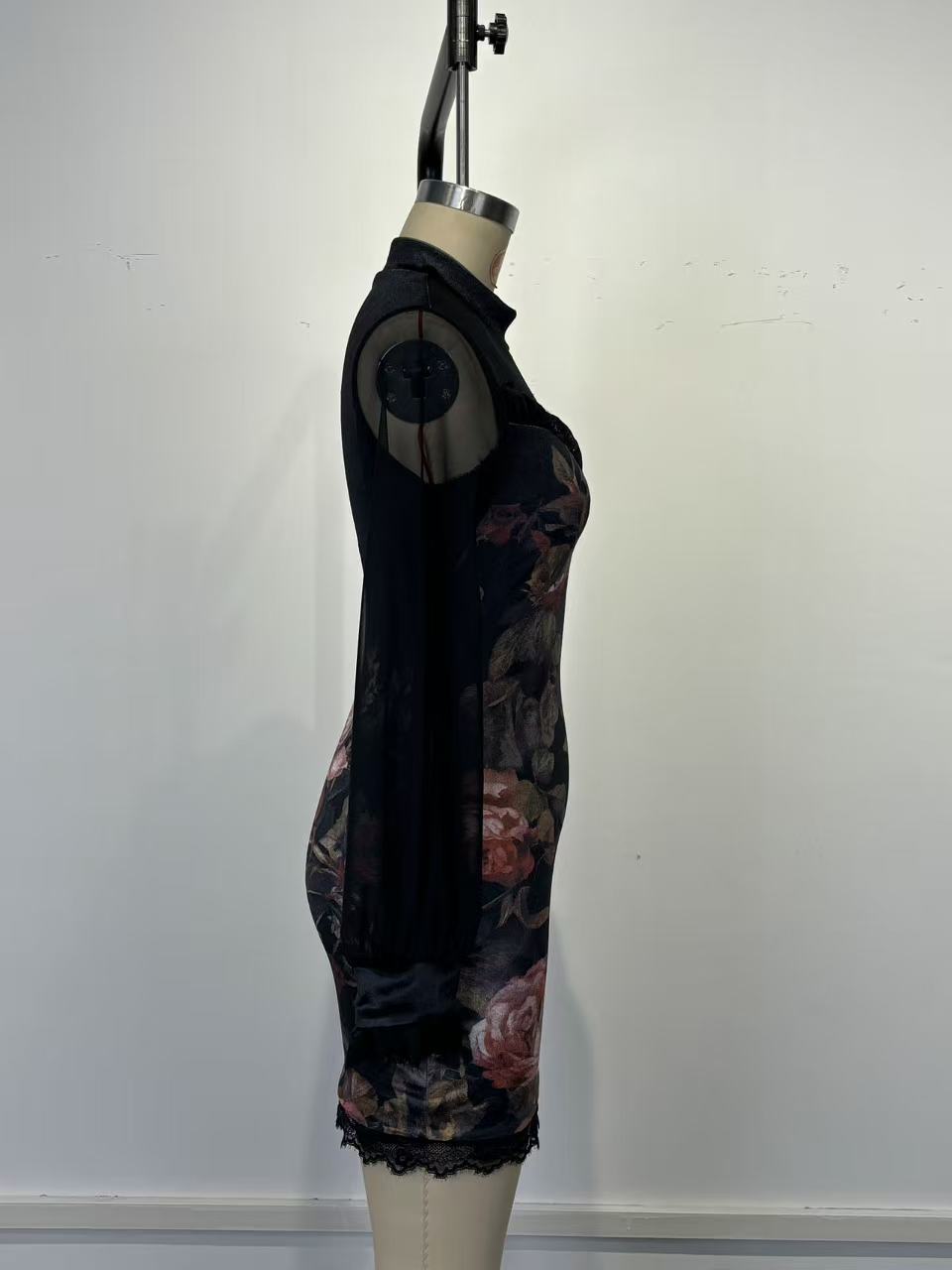 Sexy Lace Stitching Dress Floral Printed Mesh Design Hip Dress
