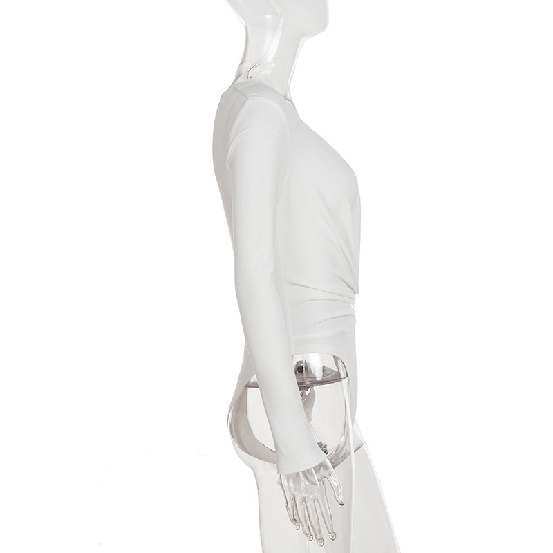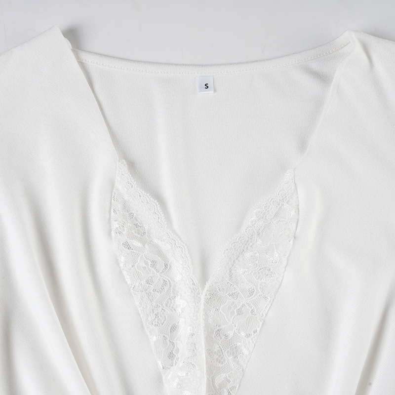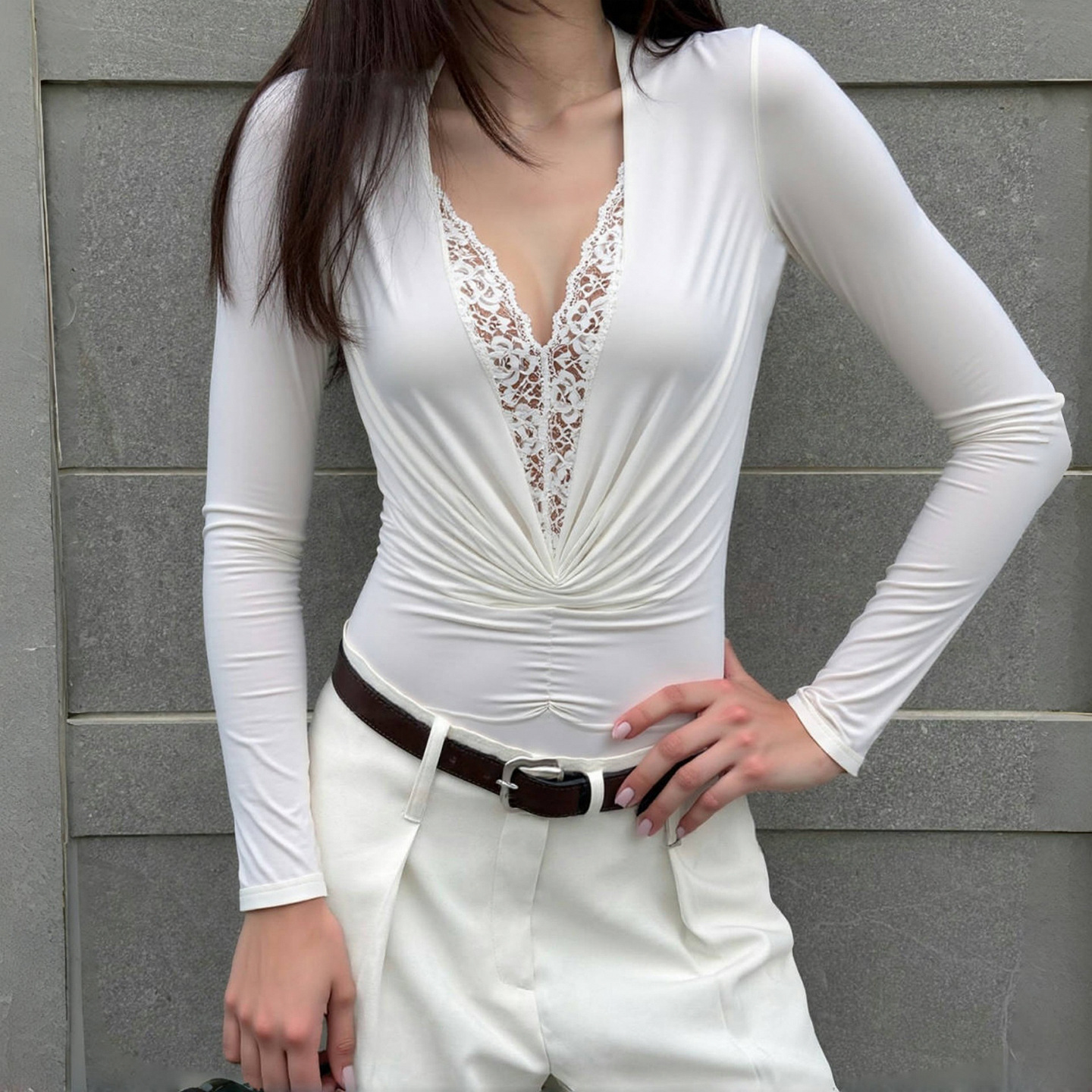 Sexy Lace V neck Patchwork Long Sleeved Jumpsuit Women Pleated Slim Top