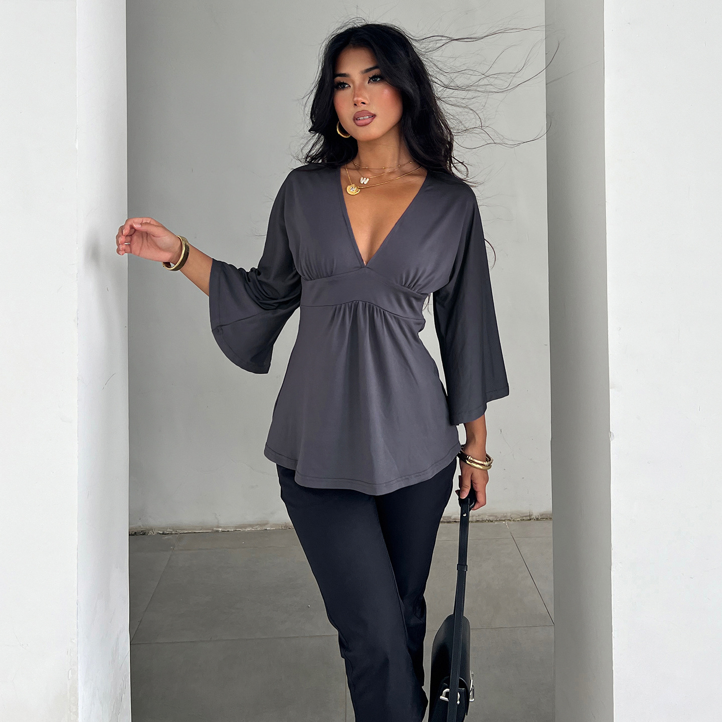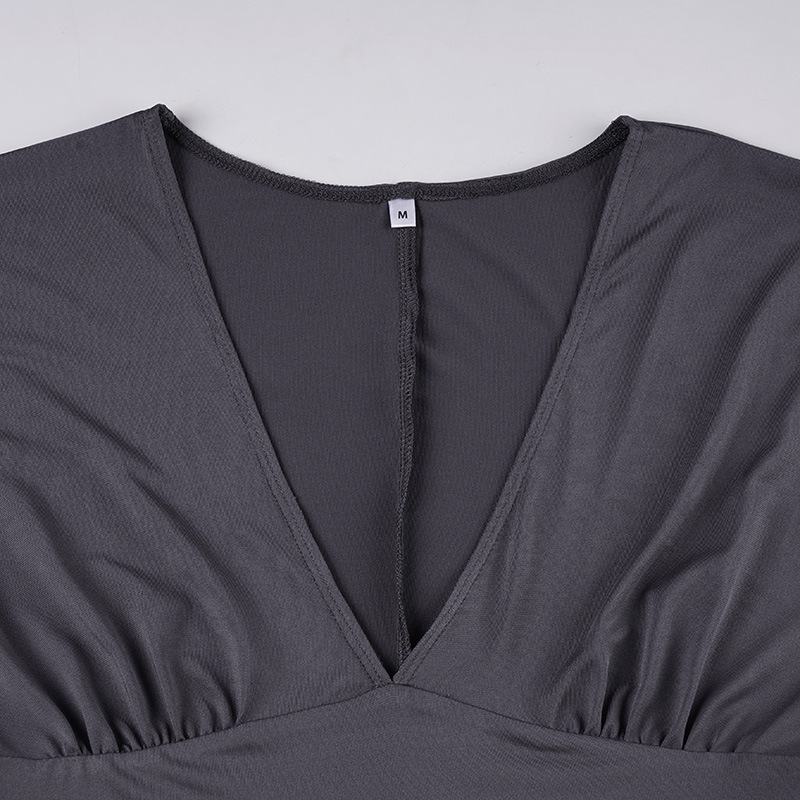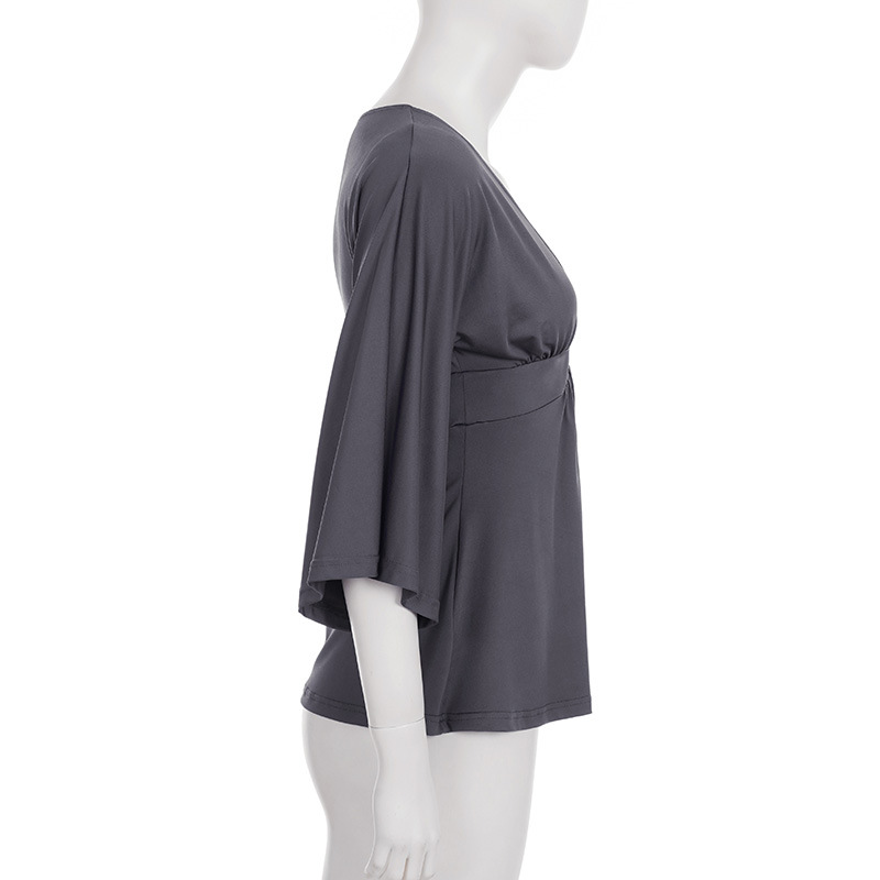 Sexy V neck Solid Color Draping Half Sleeve T shirt Women Bell Sleeve Waist Controlled a Swing Top