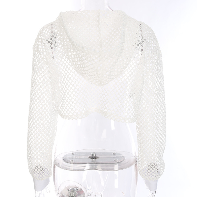 Sexy Women Wear Solid Color Mesh Blouse Sun Protection Top Hollow Out Cutout out See through Simple Hooded T shirt