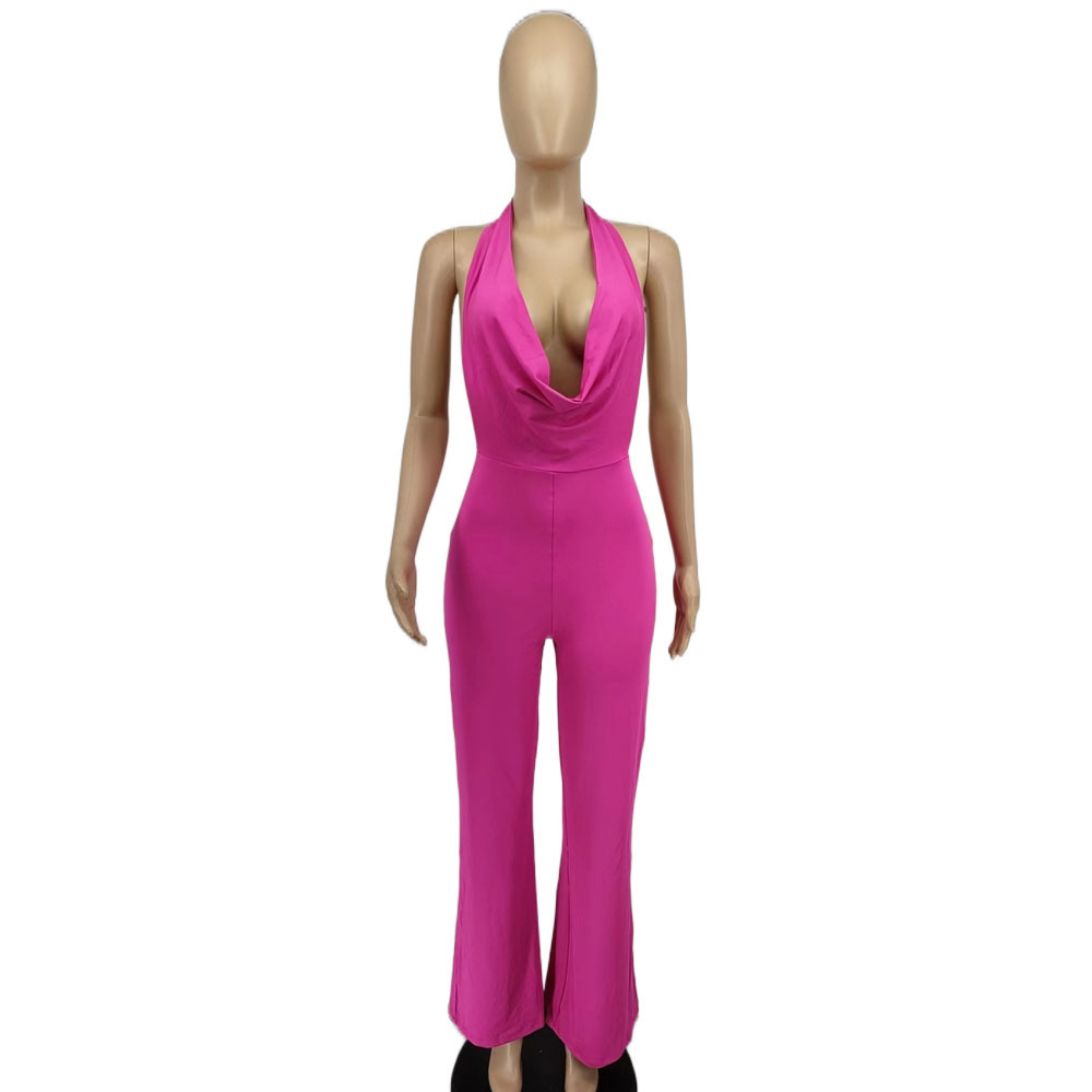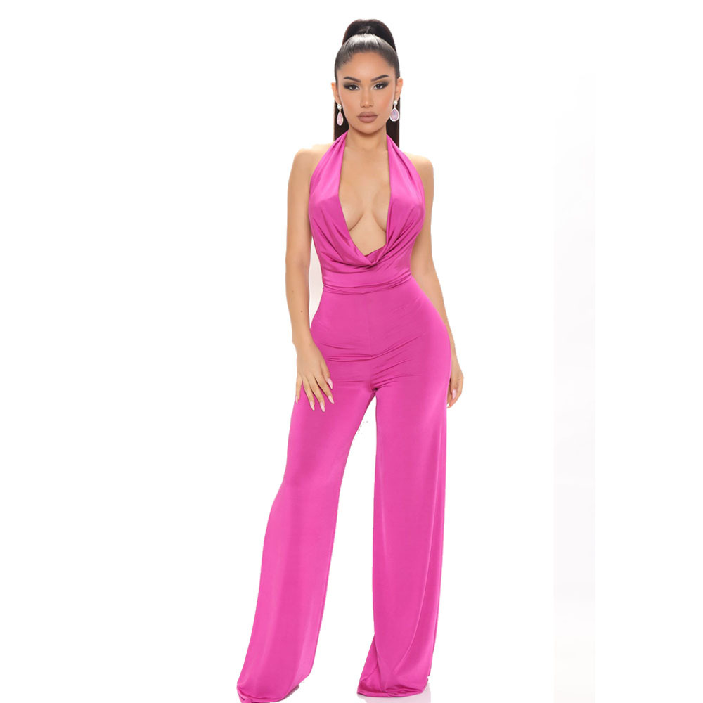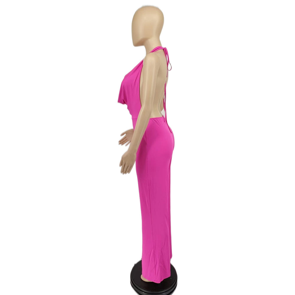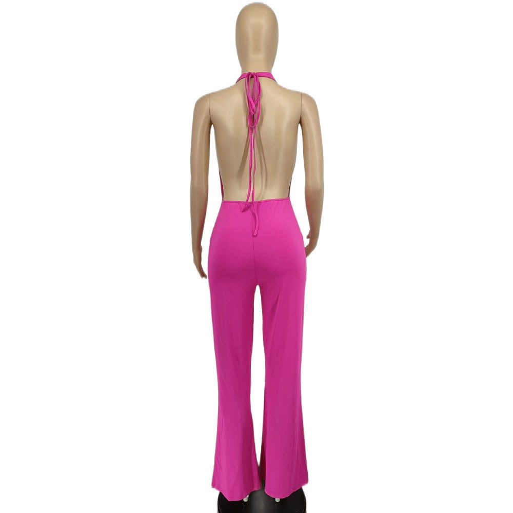 Spring Sexy Women Clothing Dress Deep V Plunge Halter Backless Tight Waist Wide Leg Jumpsuit