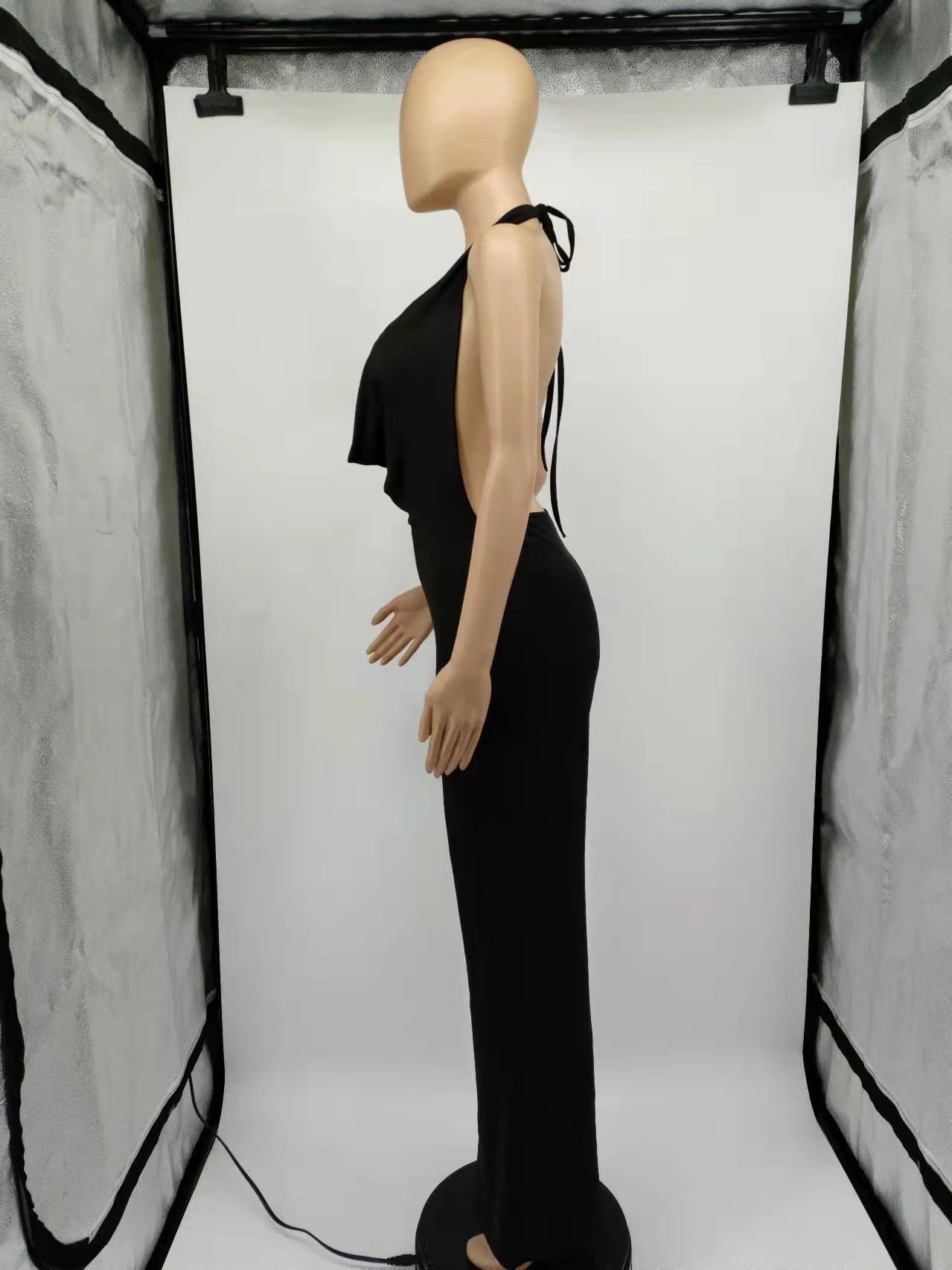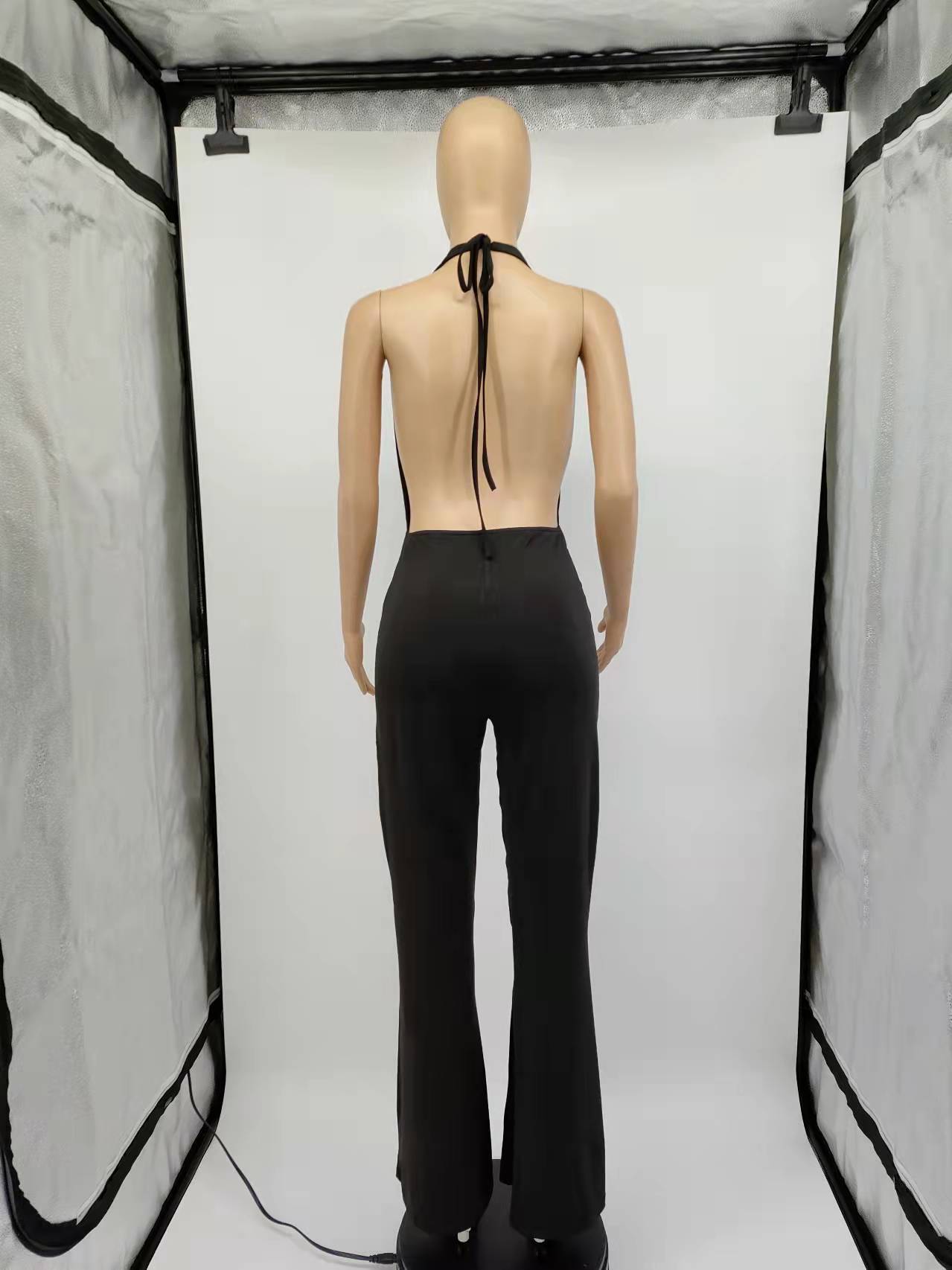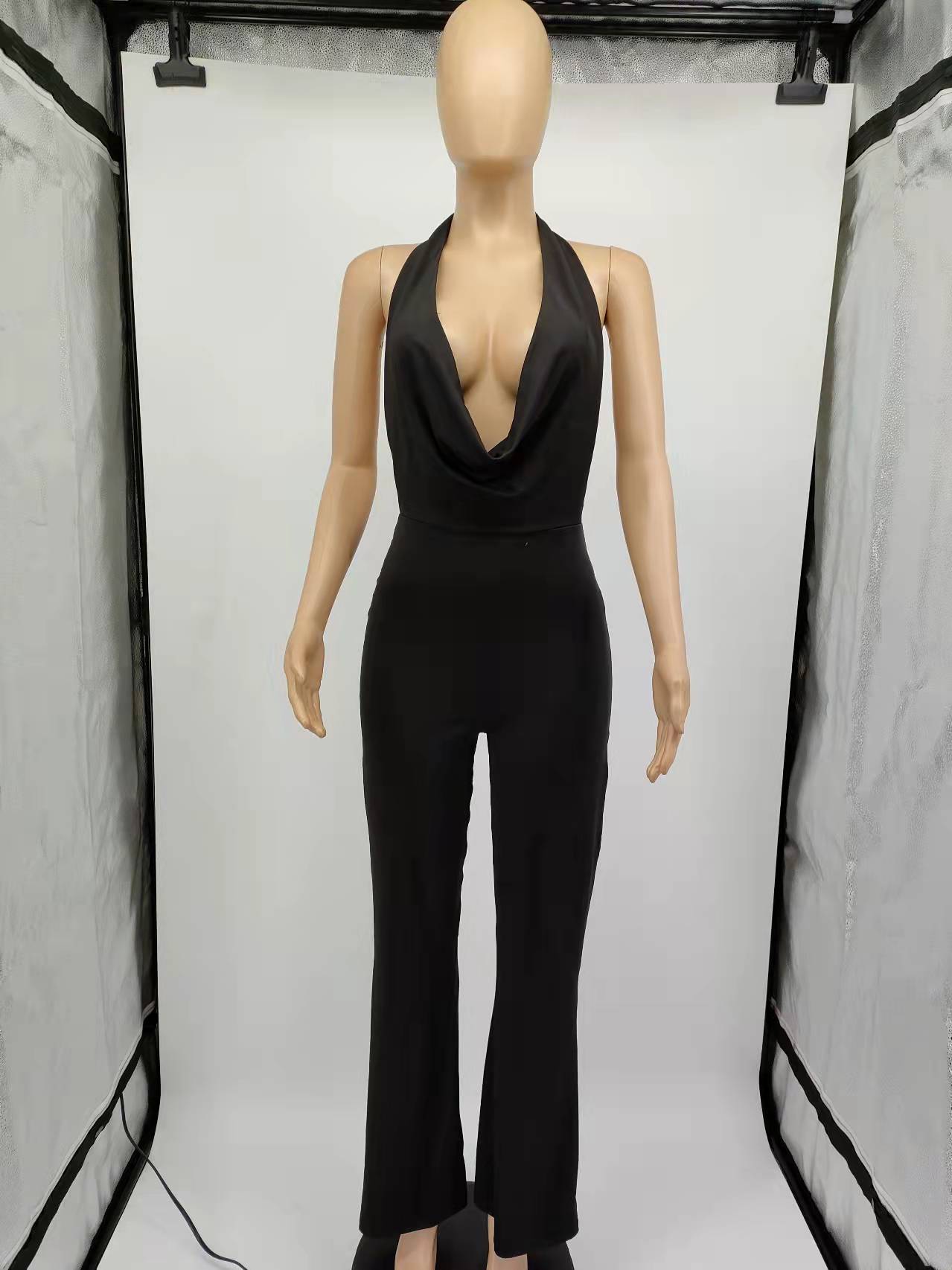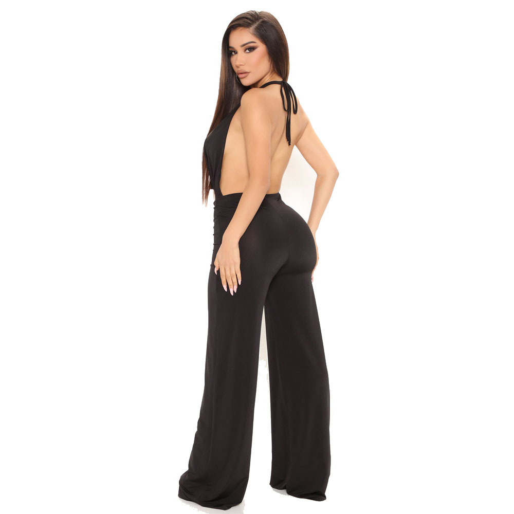 Spring Sexy Women Clothing Dress Deep V Plunge Halter Backless Tight Waist Wide Leg Jumpsuit