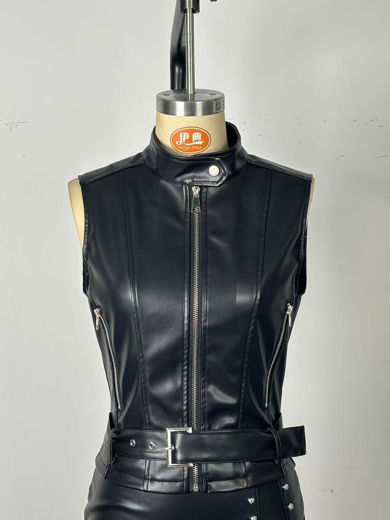 Stand Collar Sleeveless Sexy Zipper Slim Belt Waist Faux Leather Vest for Women