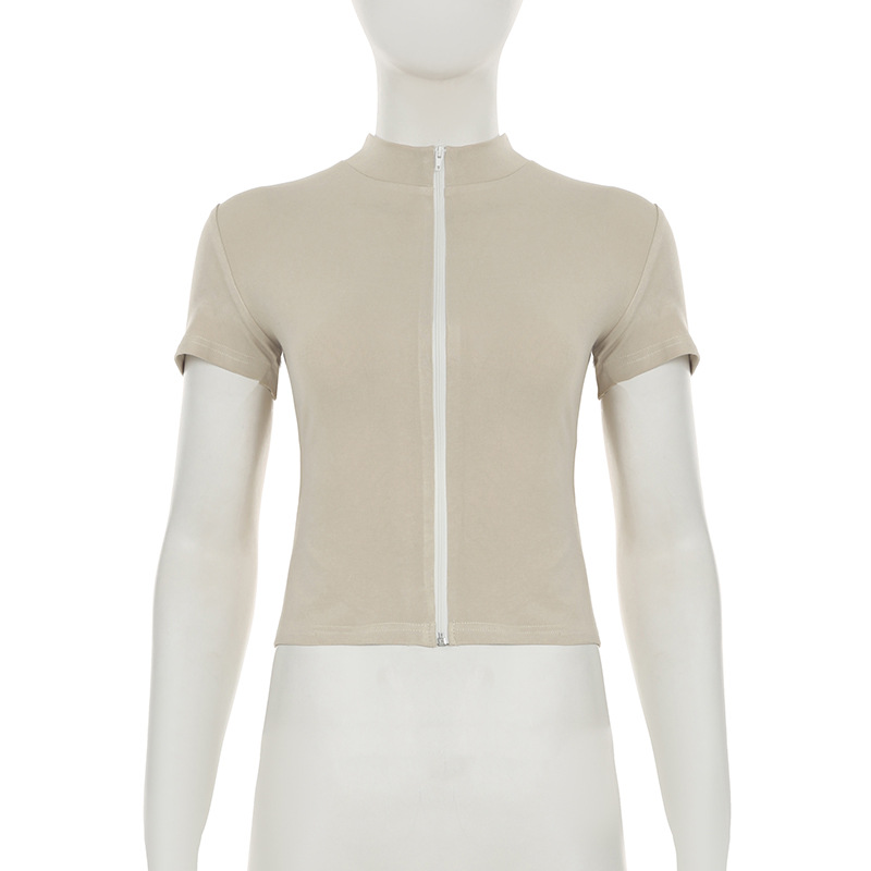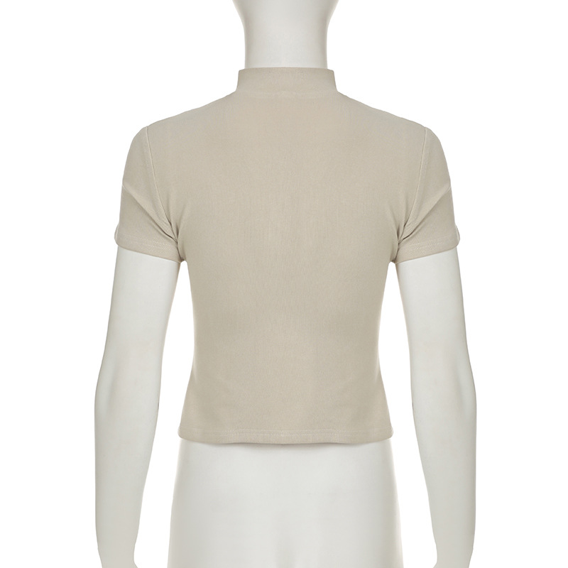 Stand Collar Zipper Short Sleeve T shirt Sexy Basic Solid Color Slim Fit Sexy Stadiumjumper
