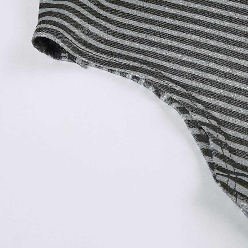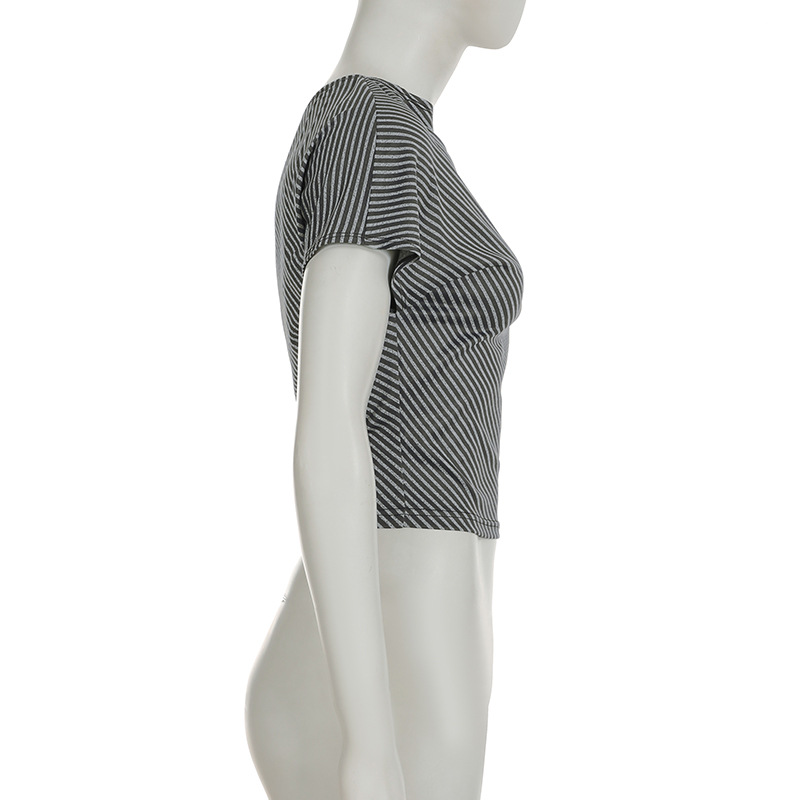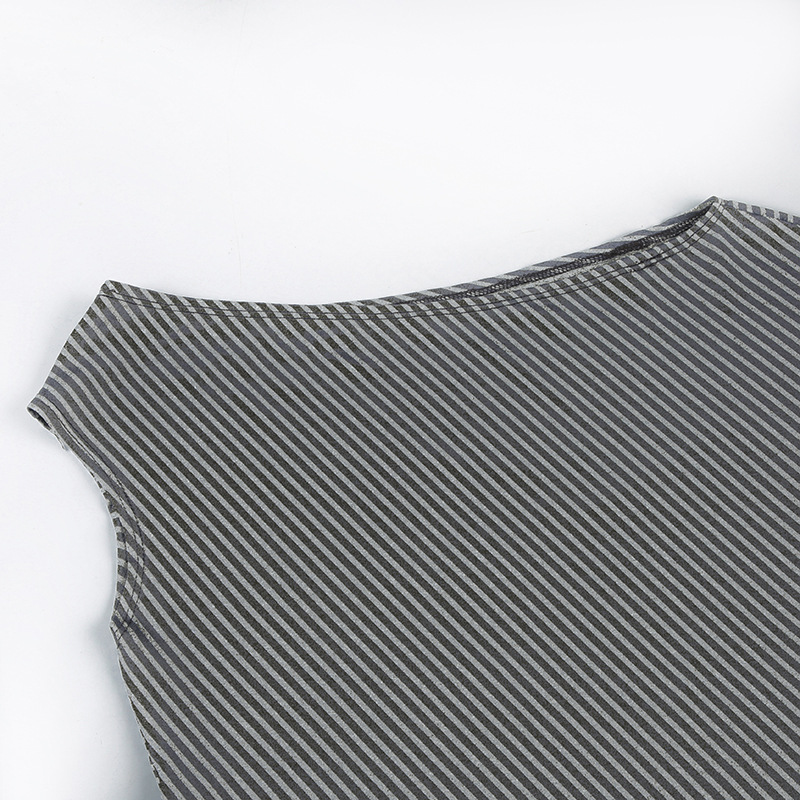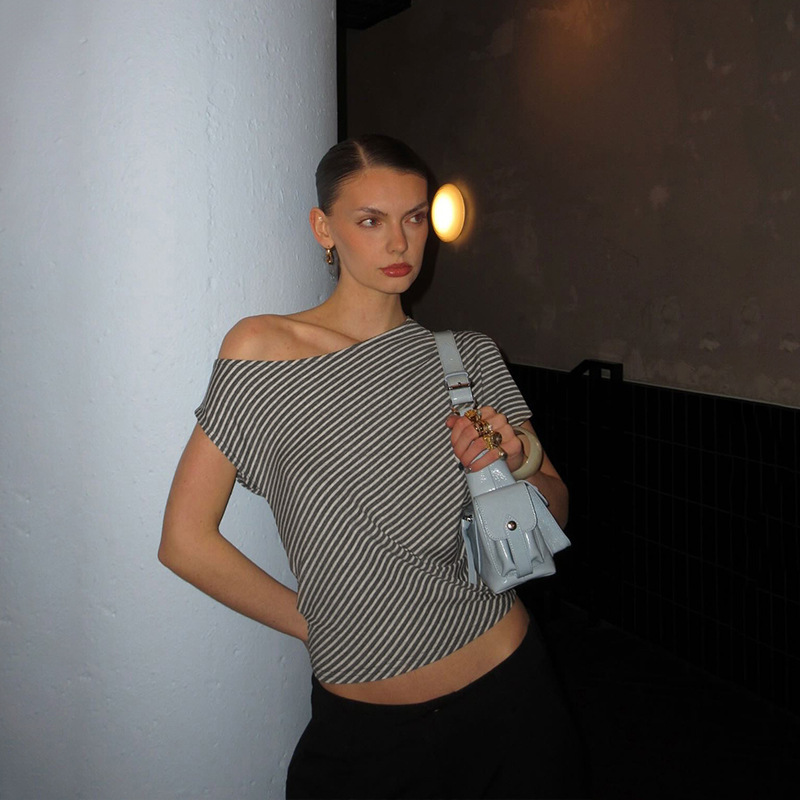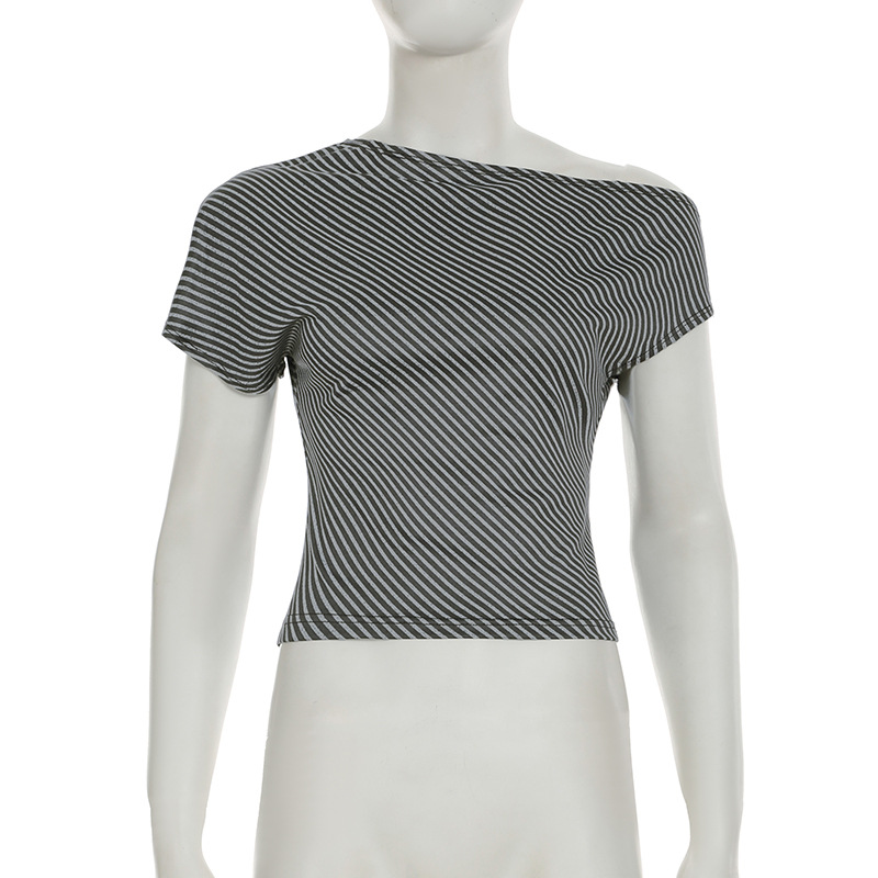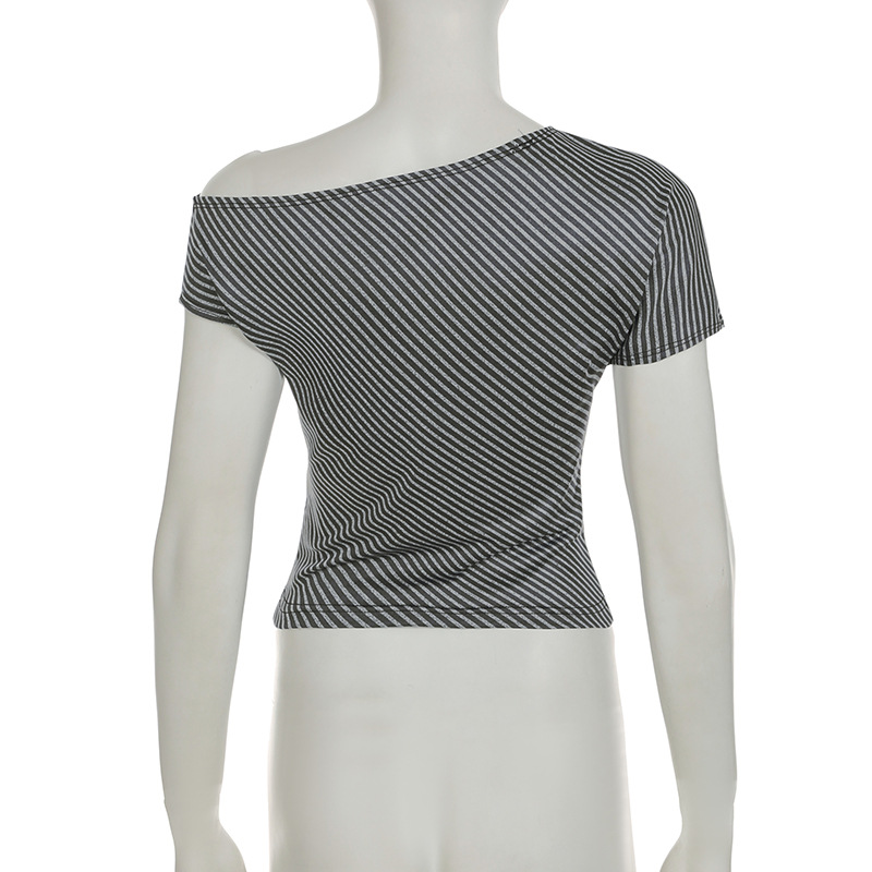 Striped Diagonal Collar Short Sleeved Top Summer Sexy Personality Shoulder Baring Irregular Asymmetric T shirt