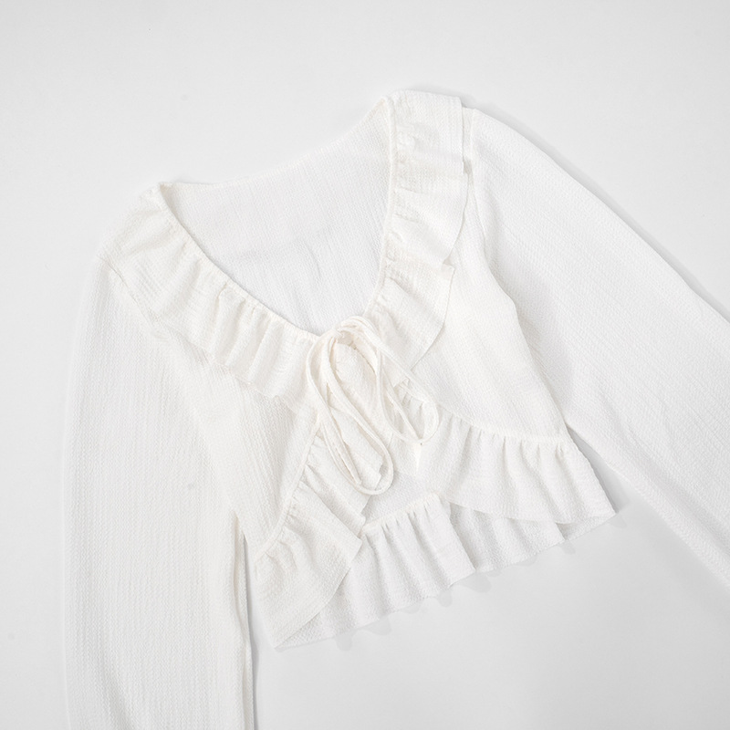 Summer Autumn Sexy Solid Color Lace Cardigan Lace up V neck Long Sleeve Top Women Clothing