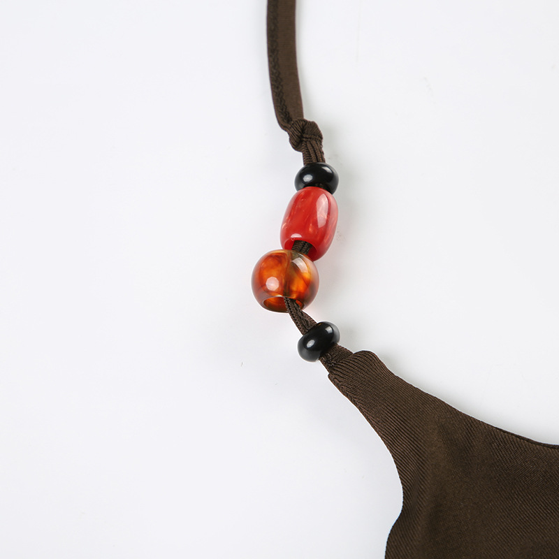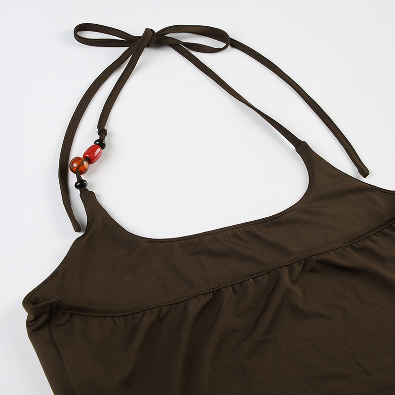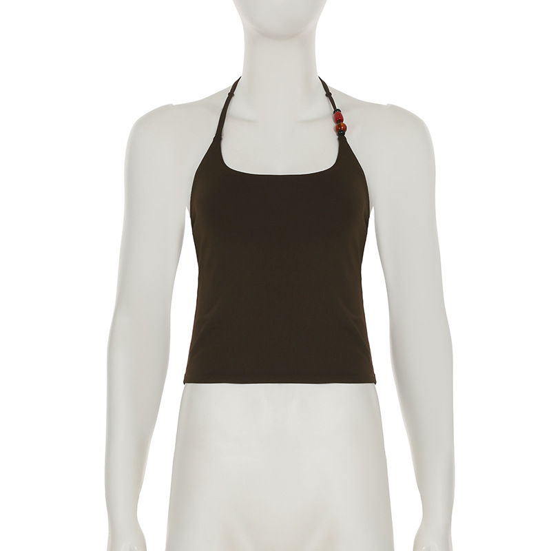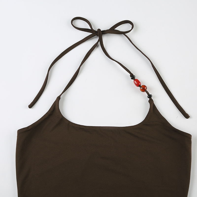 Summer Beaded Halter Lace up Vest Sexy Backless Solid Color Sports Casual Top