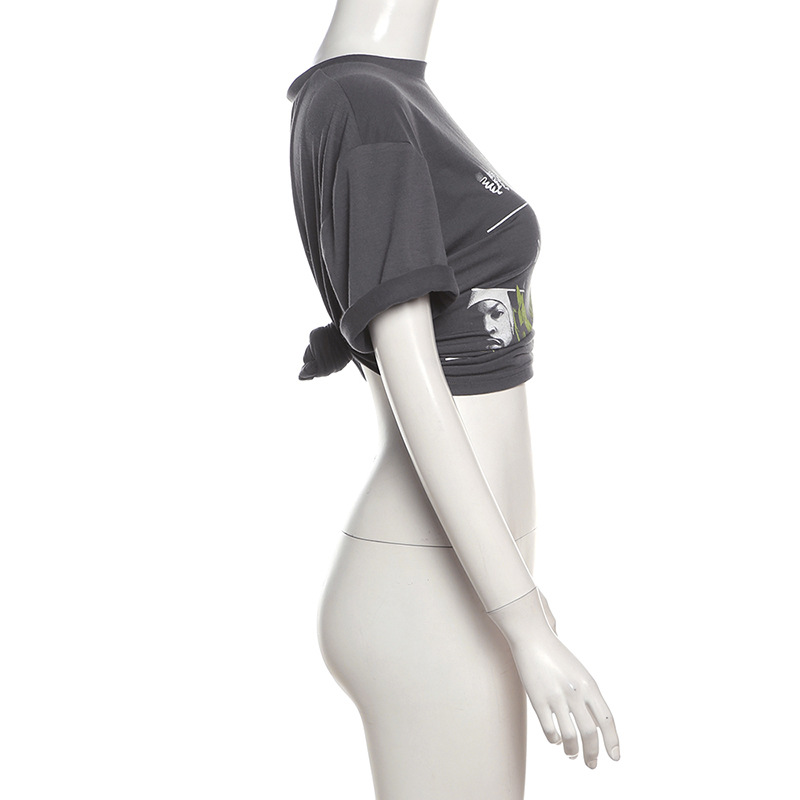 Summer Casual Sexy Bare Cropped Slim Fit Round Neck Print T Shirt Top Women